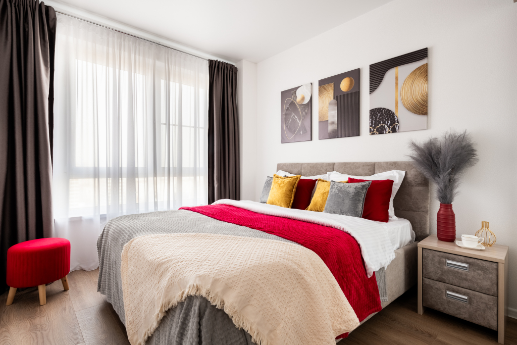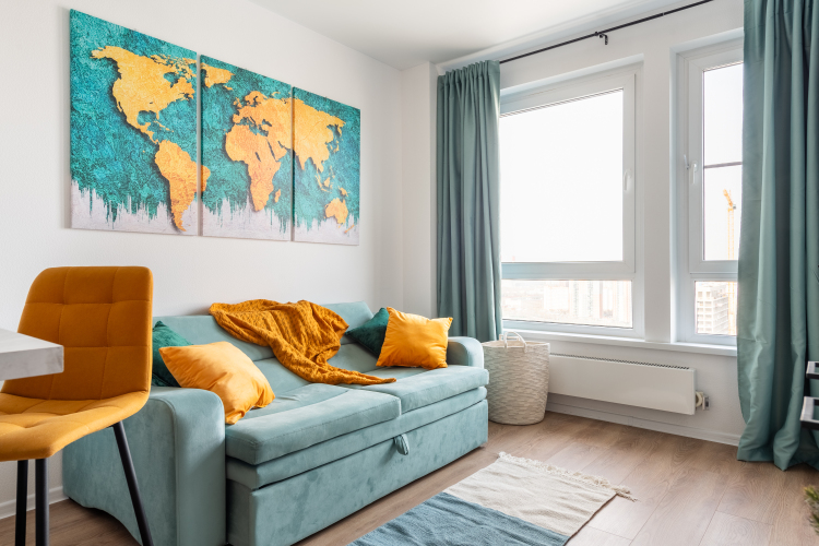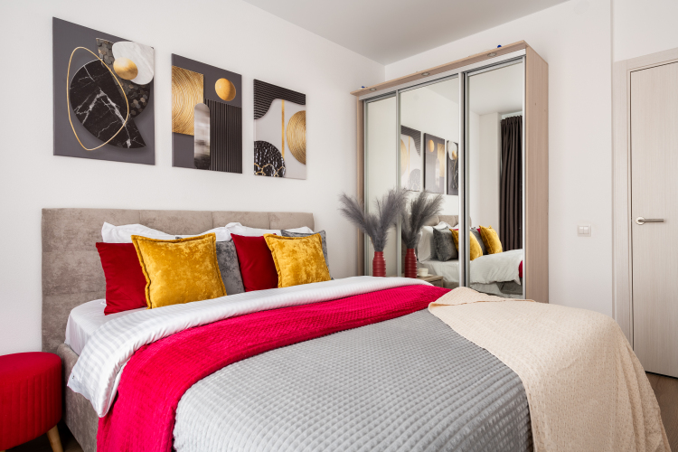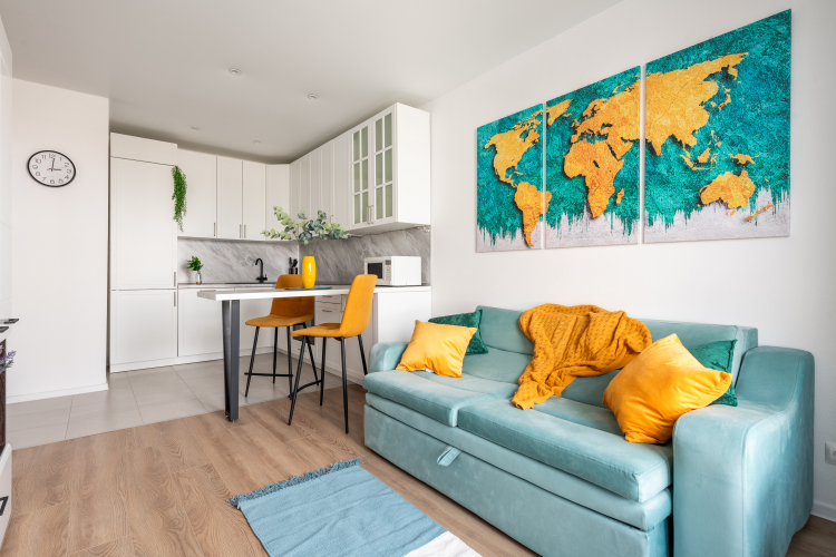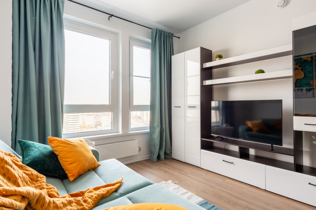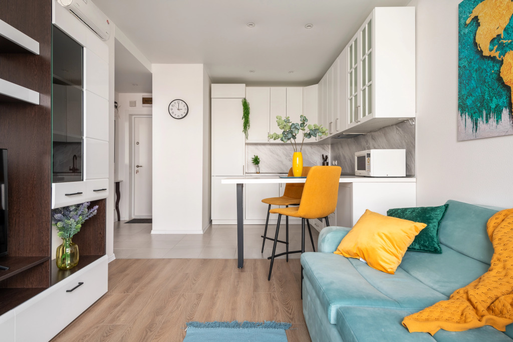 В однокомнатной квартире, евродвушке, возможно размещение 4 гостей. Для проживания гостей имеется мультимедиа: Wi-Fi, телевизор смарт ТВ. Бытовая техника: холодильник, плита, фен, утюг, стиральная машина, посудомоечная машина, микроволновая печь. Дополнительно: полотенца, постельное бельё, средства личной гигиены, комплект посуды и столовых приборов. Спальное место: кровать, раскладной двуспальный диван и шторы блэк-аут.