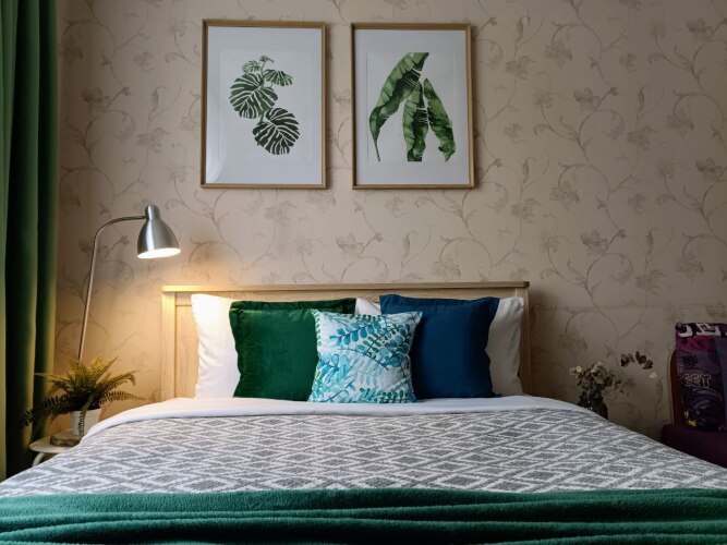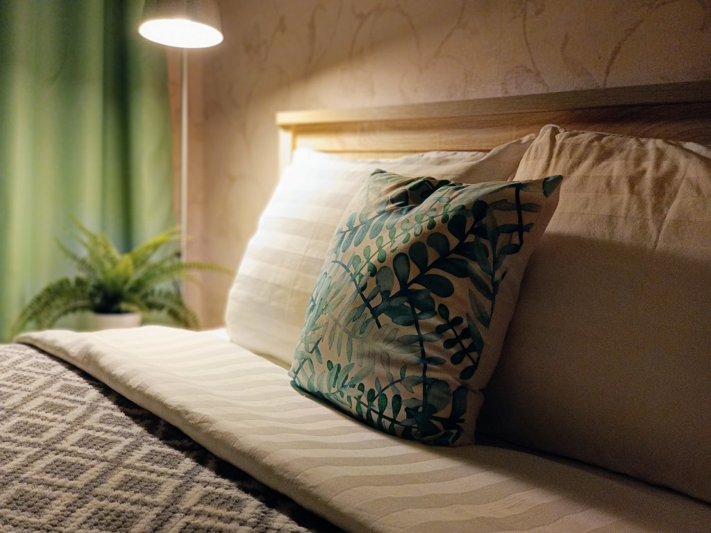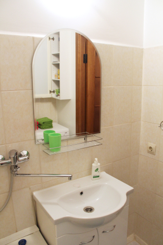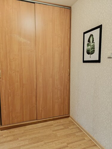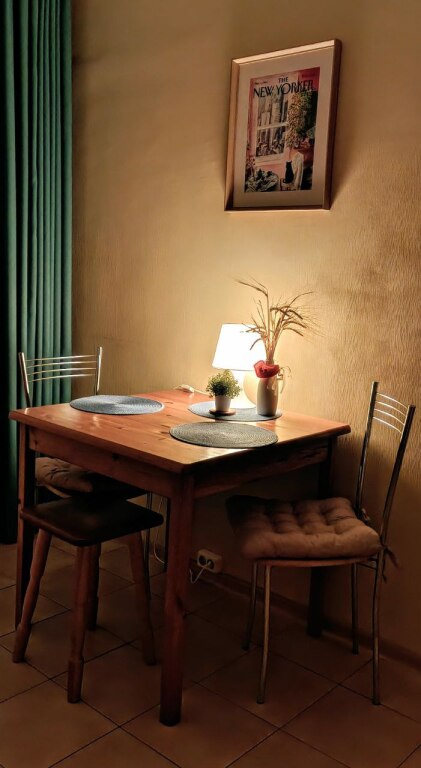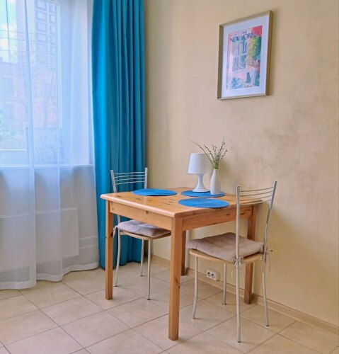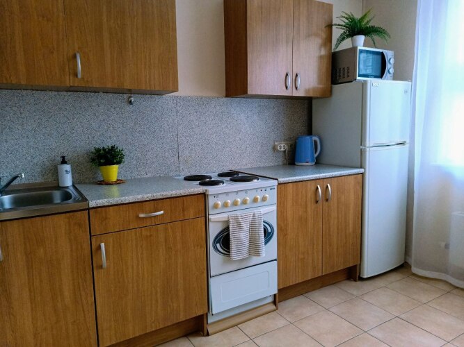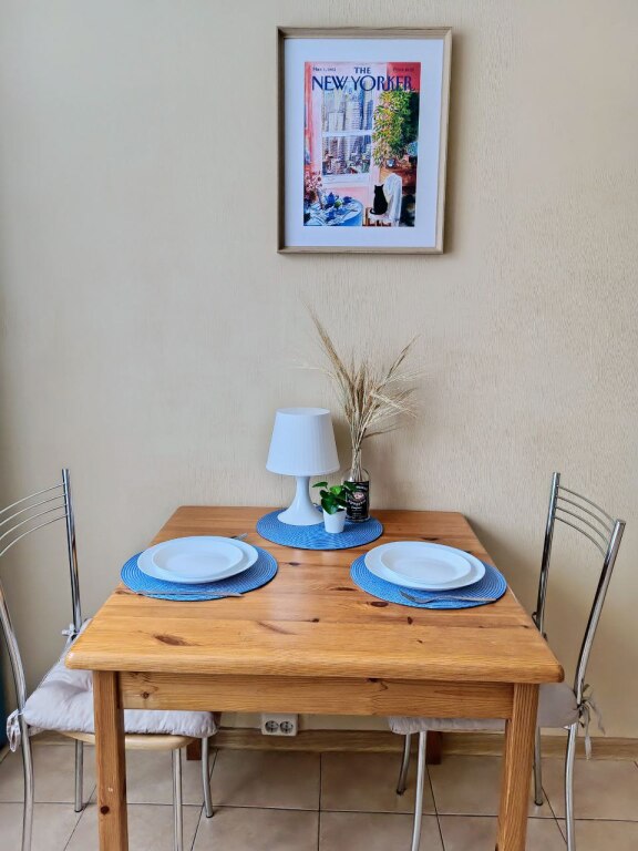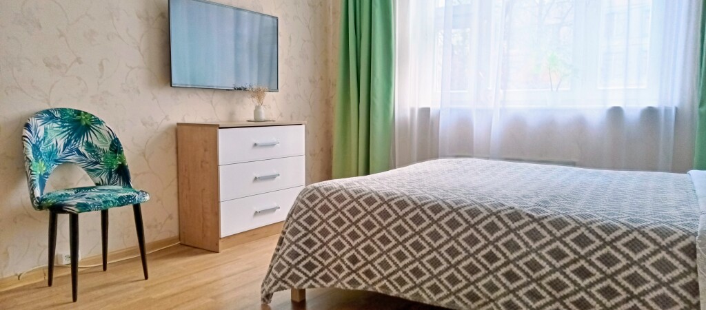 Однокомнатная квартира находится на первом этаже, окна выходят во двор, на детский сад. Общая площадь апартаментов 35.5 кв.м., жилая комната — 15 кв.м., кухня — 9 кв.м., санузел раздельный, есть холл. Система хранения вещей: 2 встроенных шкафа-купе. В квартире с комфортом разместятся 4 гостя. Спальные места: двуспальная кровать 140х200 см и двухместный диван со спальным местом 140х200 см.