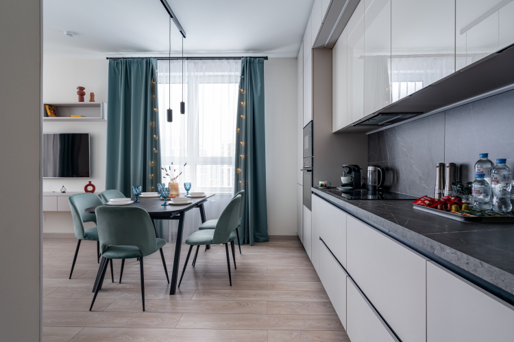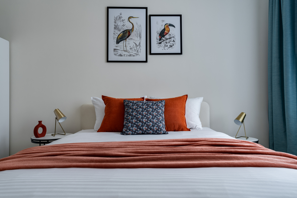 Апартаменты подходят для резмещение 6 гостей. В распоряжении гостей есть 2 отдельные спальни с двуспальными кроватями с ортопедическими матрасами, шторами black-out и разным сценарием освещения. В кухне-гостиной: кухонный гарнитур, холодильник, ПММ, СВЧ, духовой шкаф, варочная панель, капсульная кофемашина, чайник, фильтр для воды, посуда и столовые приборы, welcome-набор, диван-кровать с ортопедическим матрасом и кресло. На кухне имеется возможность организовать рабочее место.