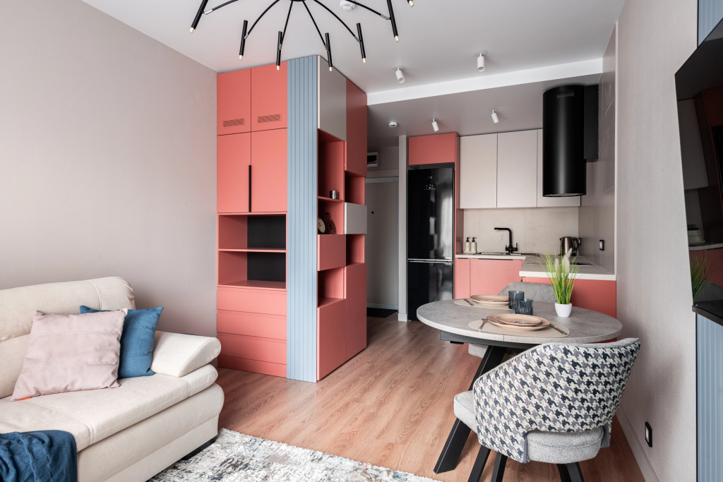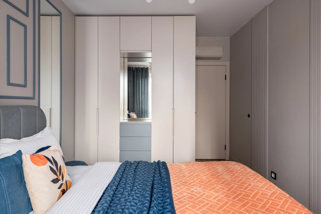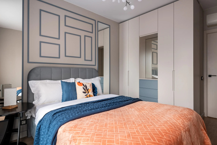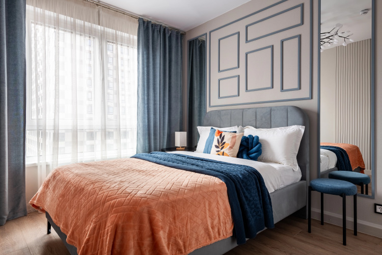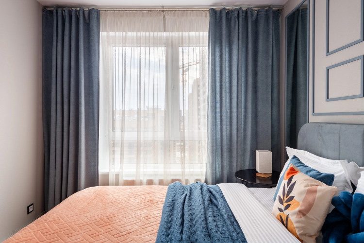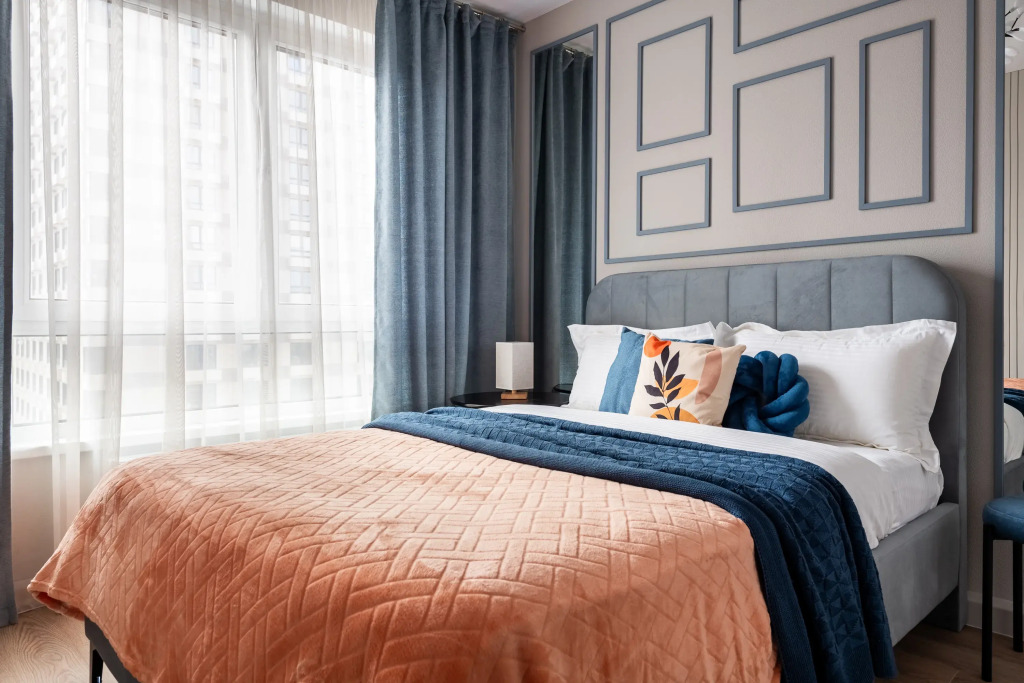 Квартира — евродвушка для размещения 4 гостей. В квартире есть мультимедиа: Wi-Fi, телевизор со Смарт-ТВ, бытовая техника: холодильник, плита, фен, утюг, стиральная машина, микроволновая печь, посудомоечная машина, кондиционер. Дополнительно: полотенца, постельное бельё, средства личной гигиены, комплект посуды и столовых приборов. Спальное место: кровать и раскладной двуспальный диван, в наличии шторы блэк-аут.