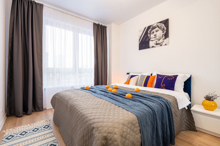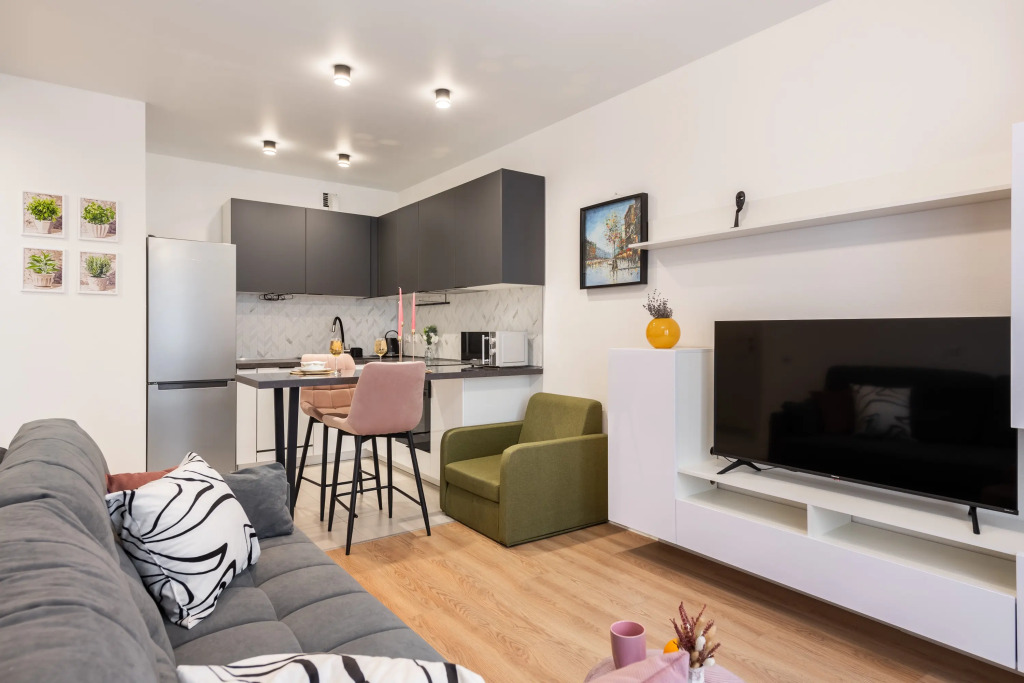 В квартире есть необходимое для комфортного проживания: Wi-Fi, телевизор Smart TV, холодильник, плита, фен, утюг, стиральная машина, посудомоечная машина, микроволновая печь, кондиционер, махровые полотенца, постельное бельё, средства личной гигиены, полный комплект посуды и столовых приборов, кровать и шторы блэк-аут, раскладной двуспальный диван.
