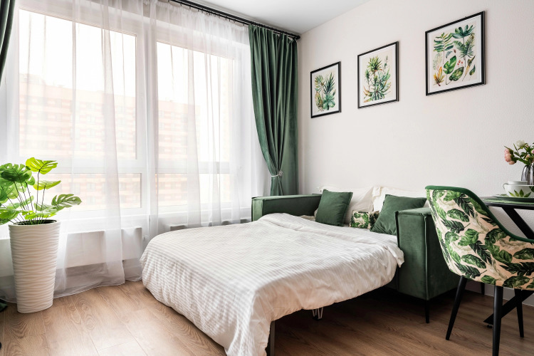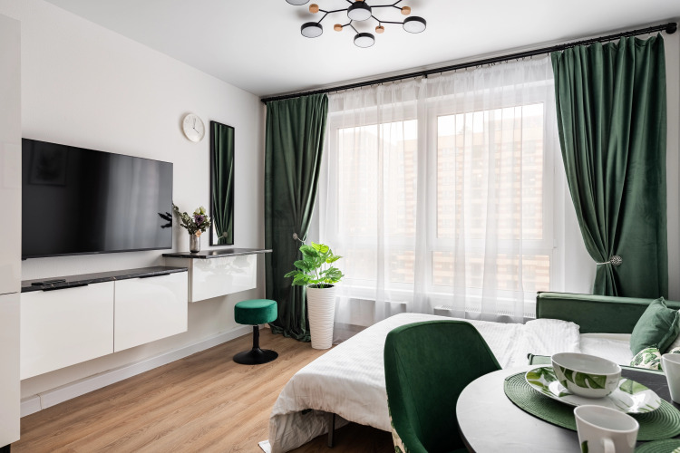 Возможно размещение до 2 гостей. В квартире имеется: Wi-Fi, телевизор со Смарт-ТВ, умный унитаз, холодильник, плита, фен, утюг, стиральная машина, посудомоечная машина, микроволновая печь, кондиционер, раскладной двуспальный диван и шторы блэк-аут. А также махровые полотенца, постельное бельё, средства личной гигиены, полный комплект посуды и столовых приборов.