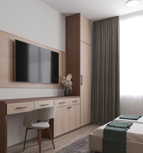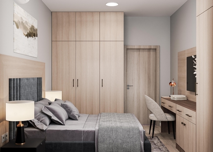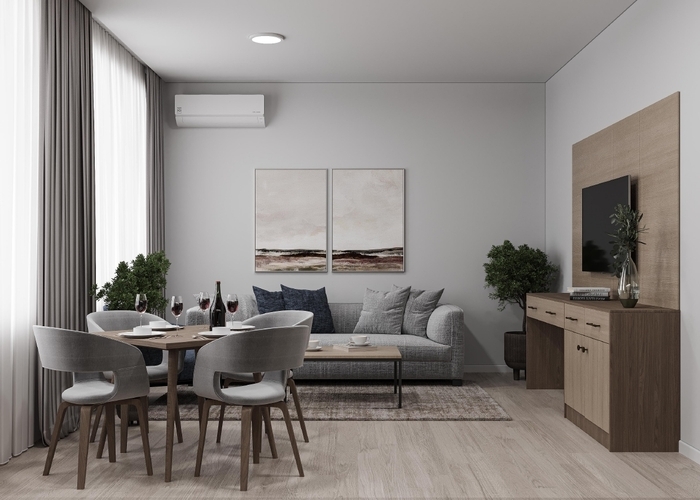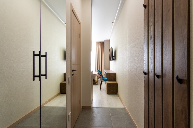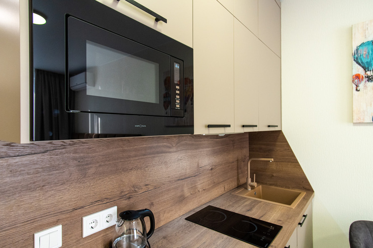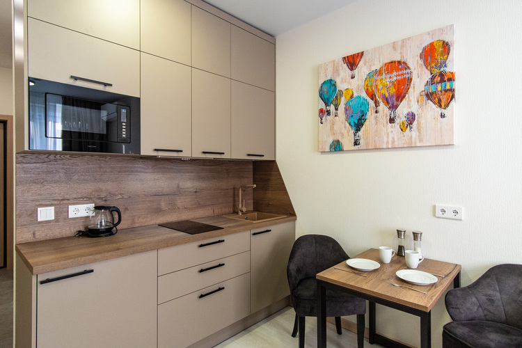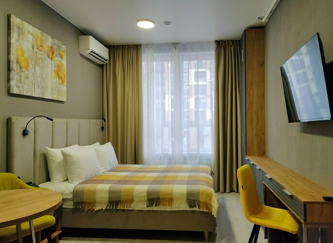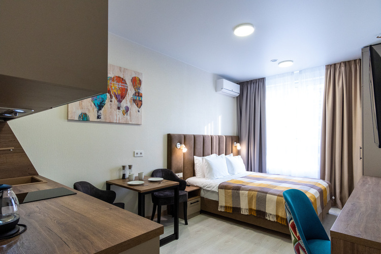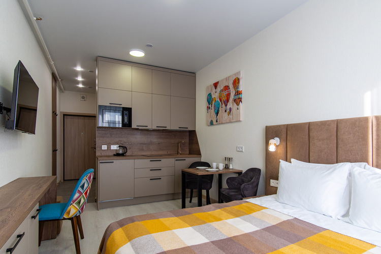 Благодаря грамотному зонированию в номере предусмотрено полноценное спальное место, кухня с обеденной зоной, где гости могут приготовить свои любимые блюда и насладиться домашней обстановкой. Стильный лаконичный интерьер и современная обстановка создают приятную атмосферу для отдыха и работы. Студия идеально подходит для проживания 1-2 гостей, которые ценят независимость и комфорт.