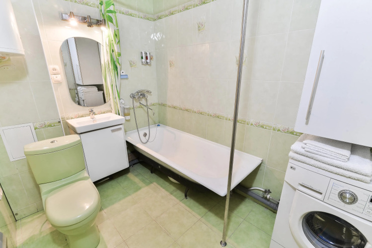 В спальне установлены двуспальная кровать и раскладной диван. На полноценной кухне есть необходимая техника и посуда. Места хранения: шкаф, комод. В ванной комнате оборудована ванна, есть стиральная машина и фен. Имеются гладильная доска, утюг, телевизор со SMART TV, кондиционер. Проведён высокоскоростной Wi-Fi.