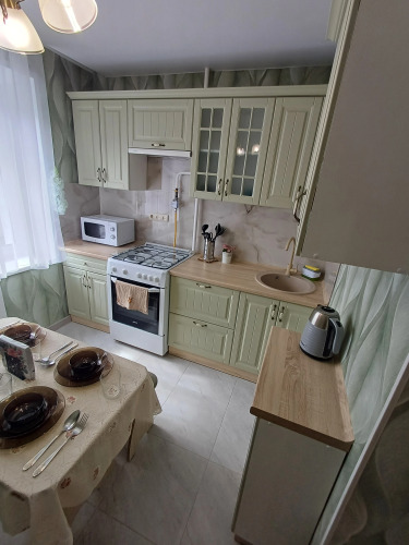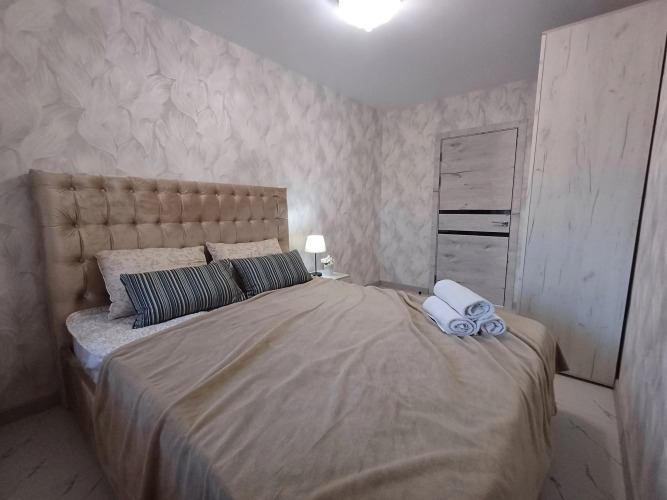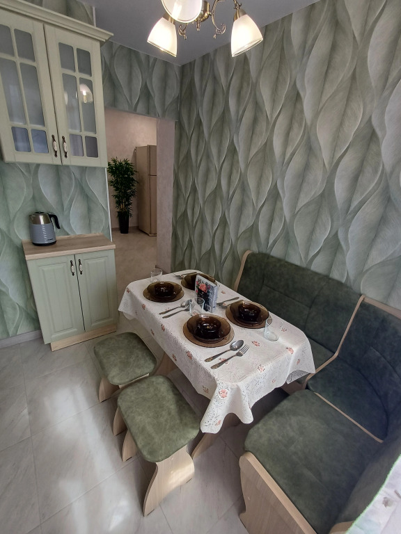 В апартаментах две изолированные комнаты. В распоряжении жильцов есть мебель и техника: встроенный кухонный гарнитур, посуда, ЖК телевизор, двуспальная кровать, односпальная раскладная кровать, раскладной четырёхспальный диван, шкафы для одежды в коридоре и спальне, кондиционер, двухкамерный холодильник, стиральная машина, микроволновая печь, электрический чайник, фен, утюг, гладильная доска и сушилка для белья. Из гостиной есть выход на застеклённую лоджию с видом во двор. Доступен бесплатный Wi-Fi.