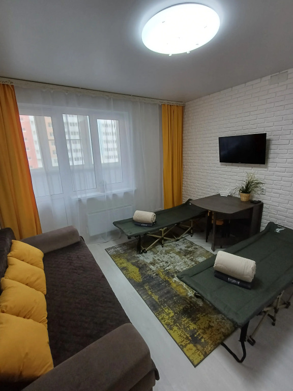 1-комнатные апартаменты 28 кв. м на 3 этаже в 10-этажном доме. В апартаментах возможно размещение до 4 человек. Спальные места: двуспальный раскладной диван и две односпальные раскладные кровати.