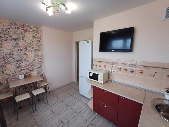 1-комнатные апартаменты 42 кв. м на 8 этаже в 14-этажном доме. В апартаментах возможно размещение до 4 человек. Спальные места: двуспальный раскладной диван и две односпальные раскладные кровати с матрацами. Дополнительно установлены: кондиционер и водонагреватель, на случай планового отключения горячей воды.