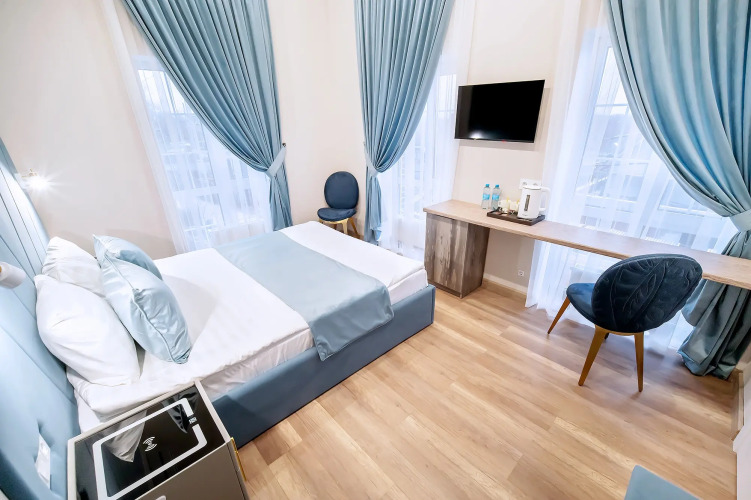 В номере вы найдёте DVD-плеер и телевизор. Оснащение зависит от выбранной категории номера.