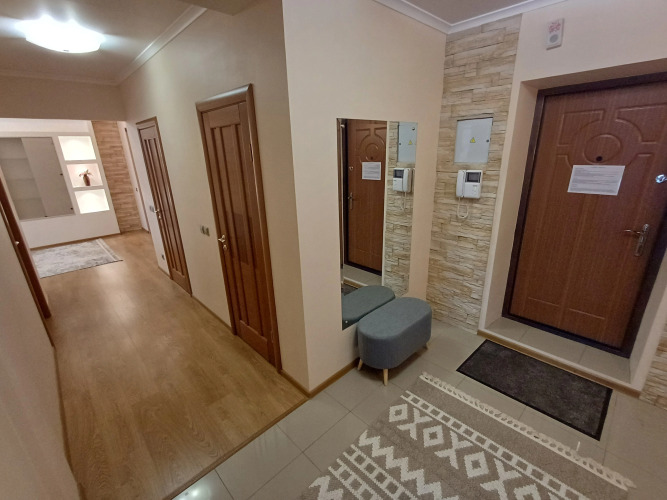 Есть двуспальная кровать и двуспальный раскладной диван, в каждой комнате и на кухне телевизоры, в коридоре настенное зеркало в полный рост и гардеробная комната.