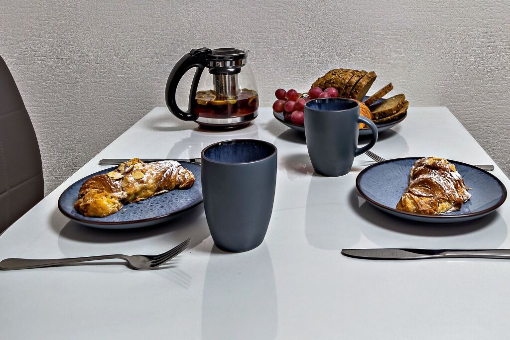 На кухне: холодильник, индукционная варочная панель, микроволновая печь, чайник, а так же посуда, приборы и фильтр для питьевой воды, чай, кофе, сахар, соль, масло, крупы.