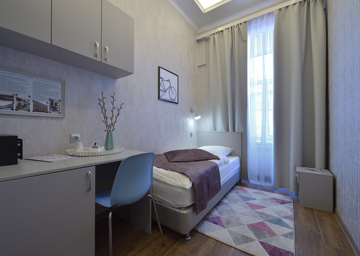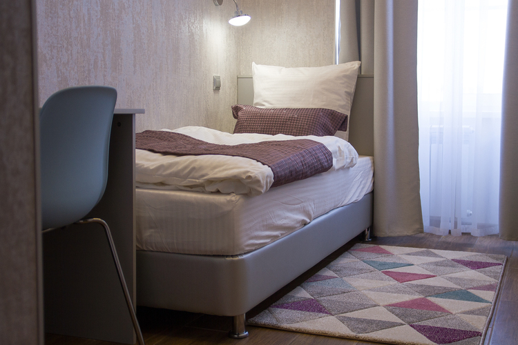Уютный небольшой номер для оптимального и комфортного размещения 1 гостя. В номере стандартная кровать с удобным ортопедическим матрацем, рабочий стол и холодильник. В номере душевая кабина и необходимые косметические принадлежности. Оборудован кондиционером, мини-холодильником, спутниковым ТВ, бесплатным WI-FI.