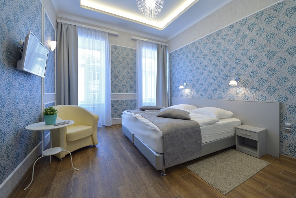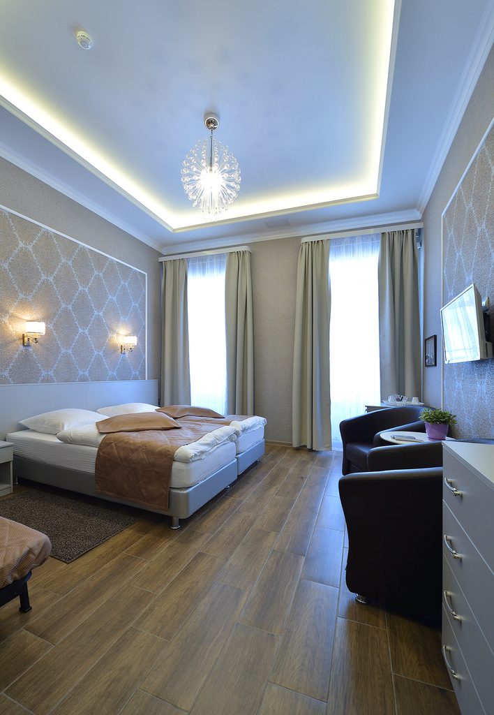 Стильный и уютный номер с высокими потолками, в котором по желанию гостей может быть одна двухспальная или две раздельные кровати. Ванная комната с душевой кабиной и всеми необходимыми туалетными принадлежностями. Номер оборудован системой кондиционирования, мини-холодильником, спутниковым ТВ, бесплатным WI-FI.