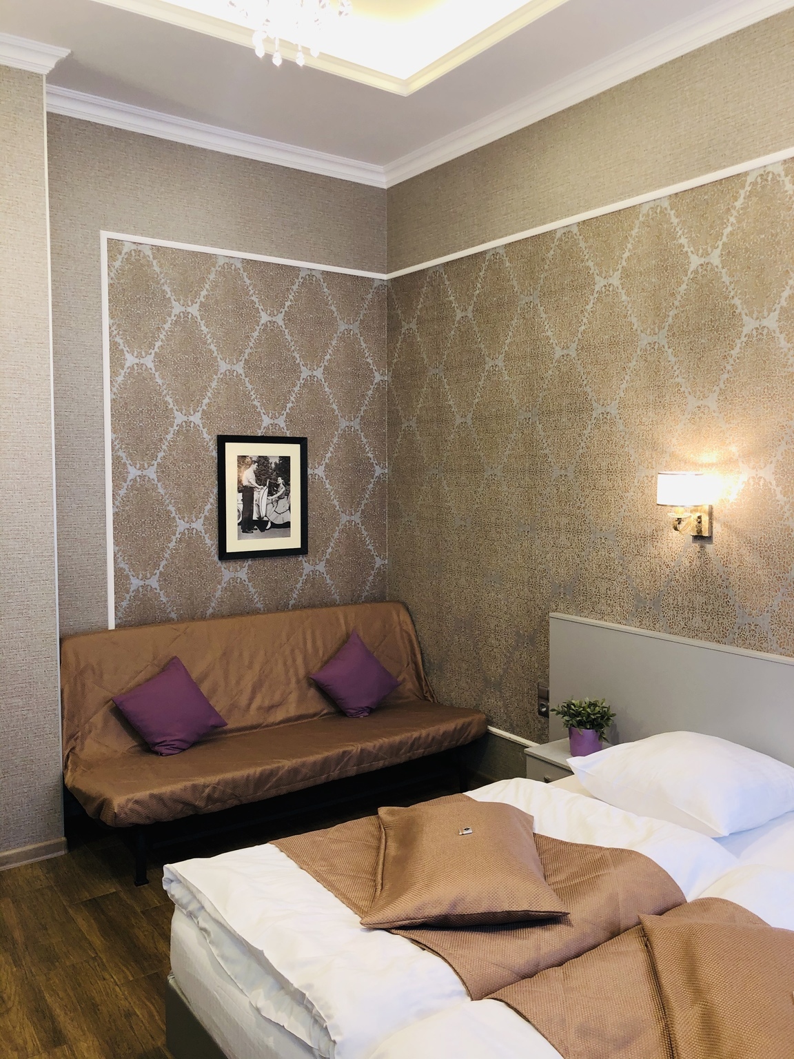 Просторный семейный номер с высокими потолками и современным интерьером оборудован кондиционером и мини-холодильником, ванной комнатой с душем и туалетными принадлежностями. Здесь могут остановиться не только гости в количестве 4-х человек, но и семейная пара с одним или двумя детьми.