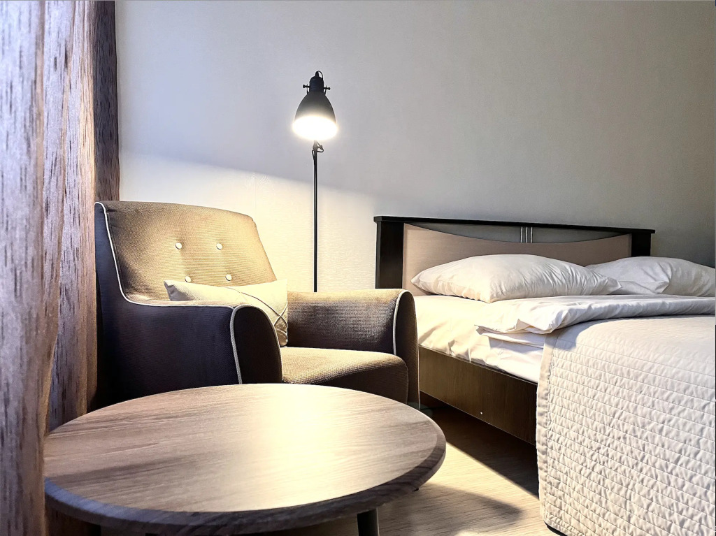 Номер уютно обставлен и оснащён необходимым, чтобы отдохнуть после долгого и насыщенного дня. Имеются телевизор. Перечисленные услуги есть не во всех номерах.