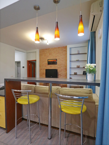 В апартаментах: телевизор, холодильник, кухонная плита, стиральная машина, микроволновая печь, электрический чайник, фен, двуспальная кровать, двуспальный диван-кровать, односпальный диван-кровать, стол. По запросу возможна установка дополнительного спального места в виде переносной кровати. Предоставляются постельное бельё и полотенца, посуда и столовые приборы, бытовая техника. В наличии также сушилка, утюг, гладильная доска и ролик. Спутниковое ТВ, высокоскоростной интернет и Wi-Fi.