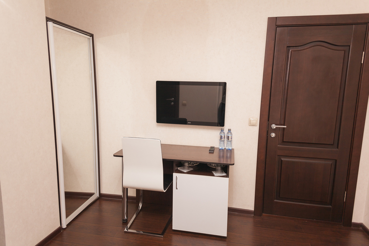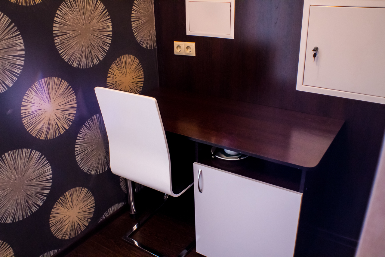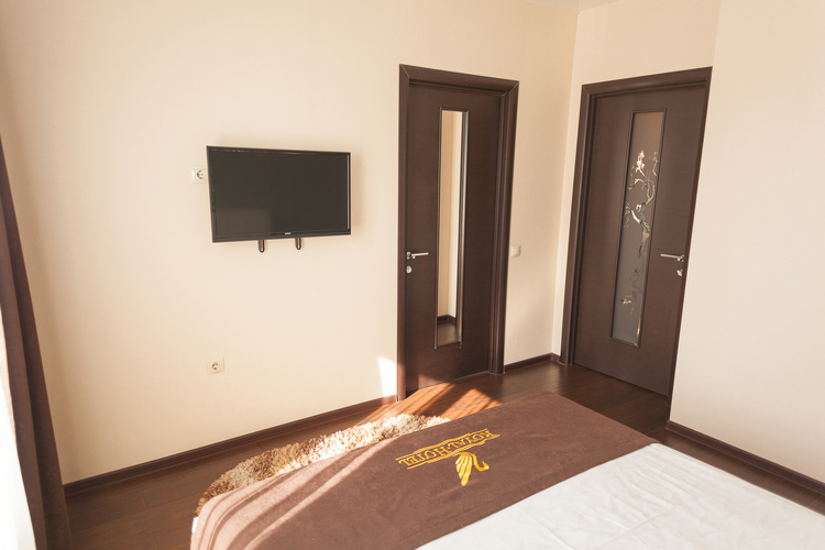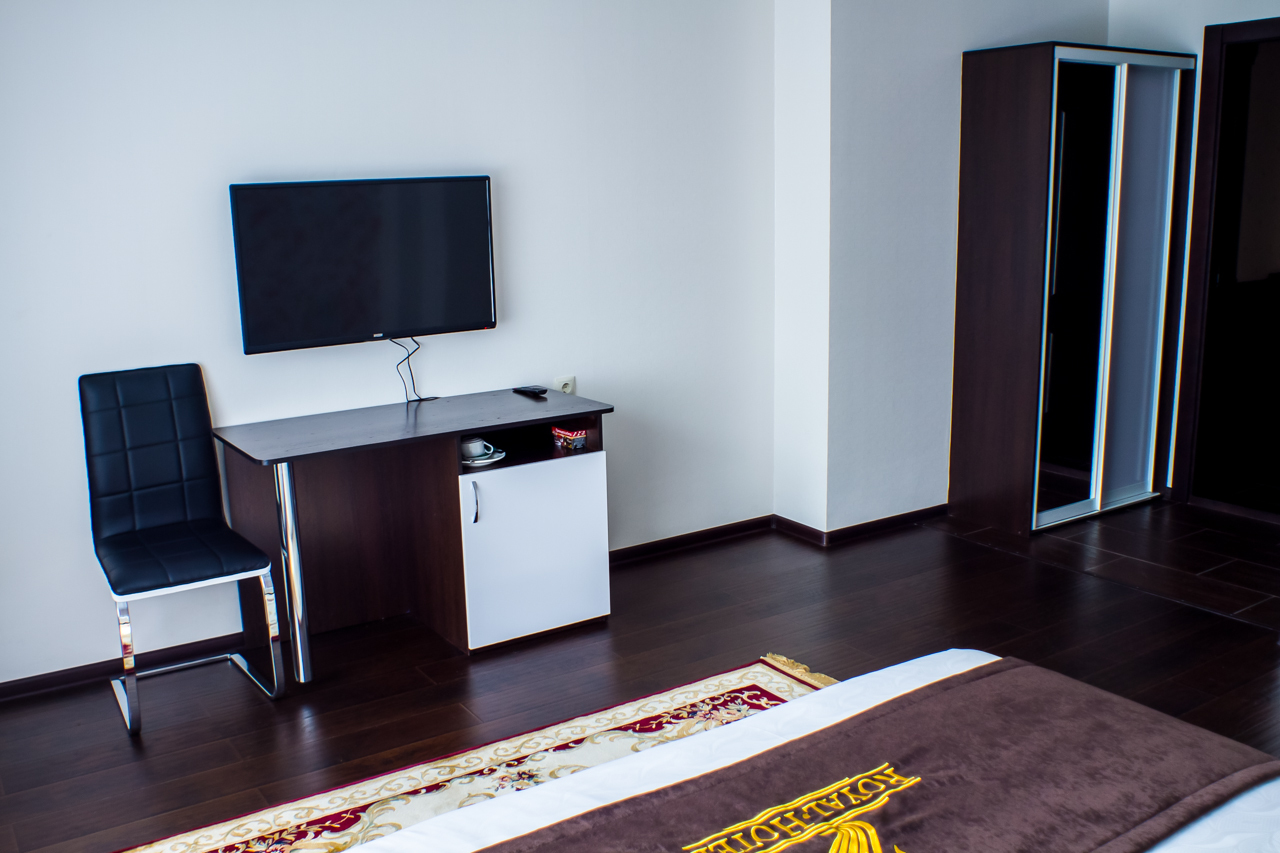 Две большие двуспальные кровати, рабочее место, шкаф-купе, тумба, два ТВ, кулер, чайник, фен, бесплатный Wi-fi, принадлежности для мытья, посуда. Душевая кабина и санузел.