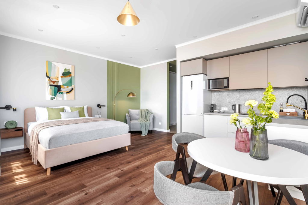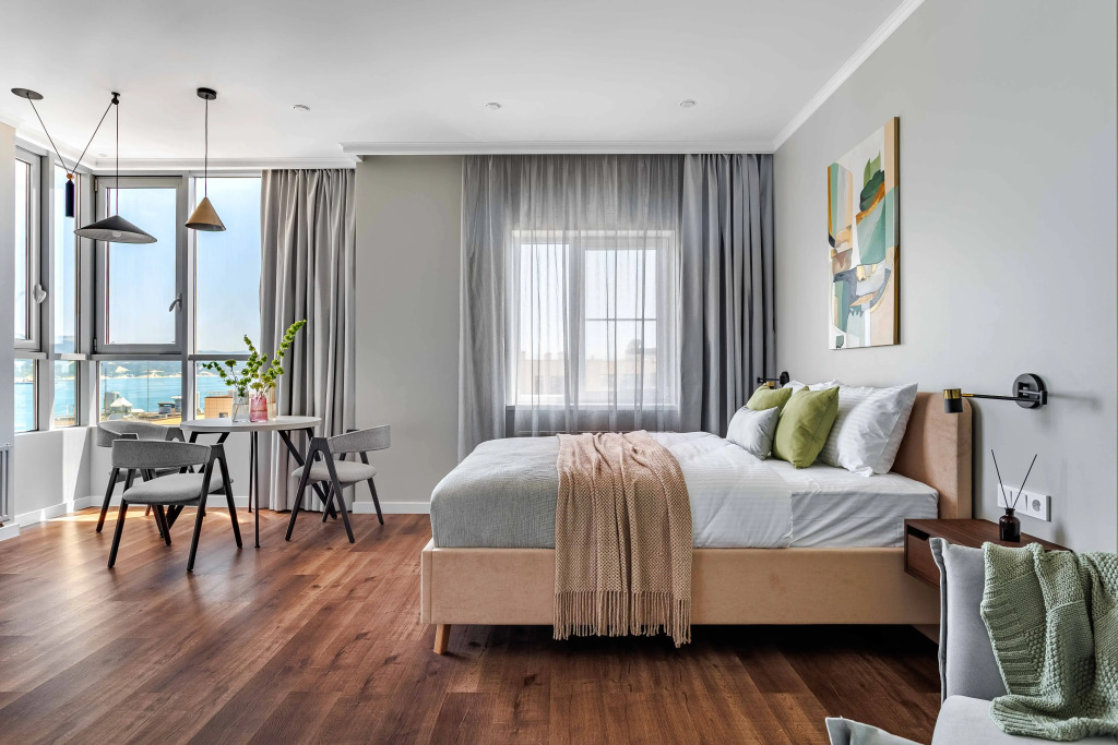 Апартаменты Оливковая студия с видом на море, адрес на карте Новороссийск, улица Шевченко, д.22, с характеристиками номеров и доступностью онлайн бронирования на сайте vashotel.ru , стоимость проживания и удобства.