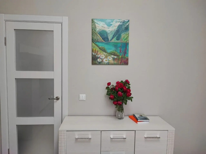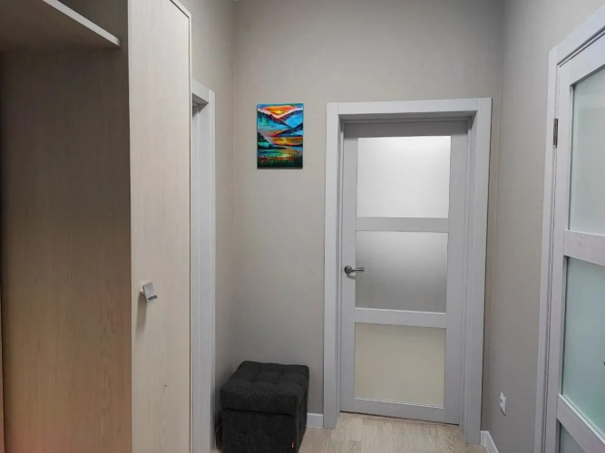 Возможно проживание от 2 до 5 человек. Для удобства гостей: кухня-гостиная, отдельная спальня с двуспальной кроватью, застеклённая лоджия, совместный санузел с ванной, обеденная зона — кухня оборудована техникой: плита, чайник, холодильник, микроволновая печь, а также посуда и столовые приборы. Работает бытовая техника: 2 телевизора, стиральная машина, пылесос, сушилка для белья, гладильная доска и утюг. На лоджии — зона отдыха с креслами-мешками.