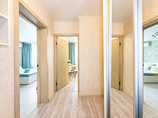 Апартаменты размером 43м2 подходят для отдыха компанией до 6 человек с размещением по 2 человека в комнате: большая двуспальная кровать с ортопедическим матрасом и два двуспальных дивана. Апартаменты оборудованы кондиционером, двумя телевизорами с выходом в YouTube, системой «Тропический душ» в ванной комнате. Дополнительно: чай, кофе, сахар, средства личной гигиены, полотенца банные и средние, фен, утюг, постельное бельё.