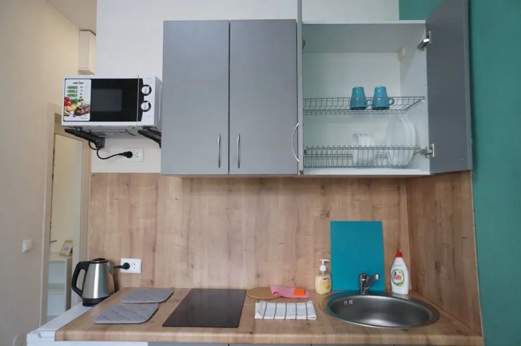 В квартире имеется: двуспальный диван и постельное бельё, телевизор, бесплатный Wi-Fi, кухонная зона с холодильником, микроволновой печью, электрической плитой, электрочайником, посудой и кухонной утварью.