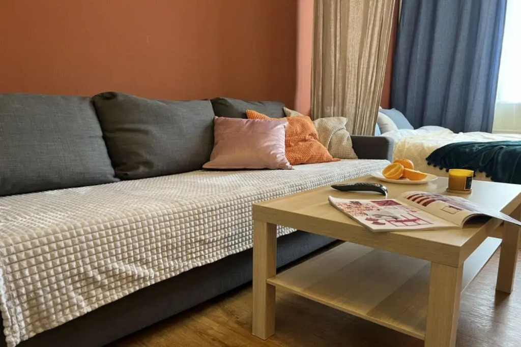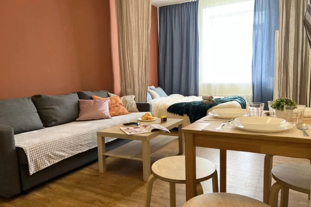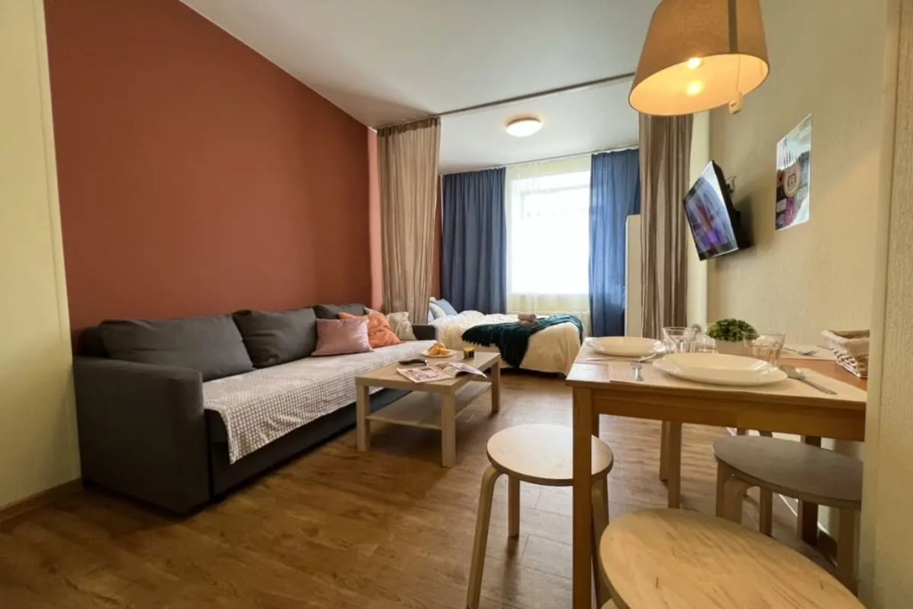 В квартире-студии есть двуспальная кровать, диван. Постельное бельё предоставляется. В распоряжении гостей телевизор и бесплатный Wi-Fi. Кухонная зона оснащена холодильником, микроволновой печью, электрической плитой, электрочайником, посудой и кухонной утварью. Для гостей подготовлены полотенца, фен, одноразовые шампунь, гель для душа и жидкое мыло. Также в распоряжении гостей: стиральная машина, сушилка, утюг и гладильная доска.