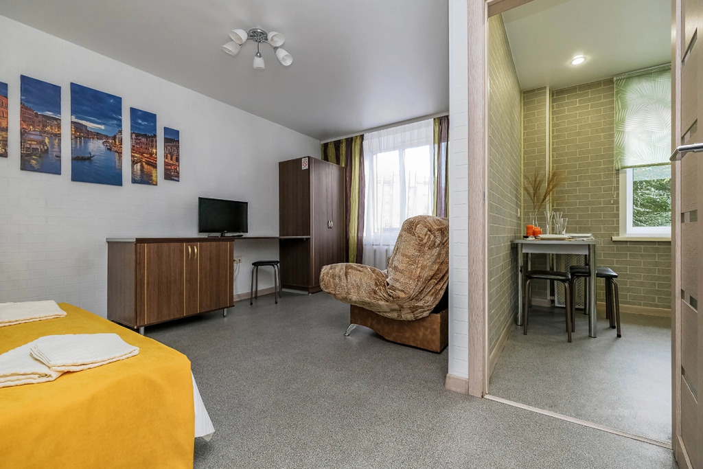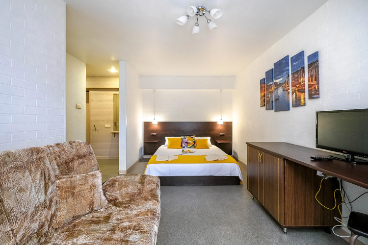 В номере вы найдёте телевизор. Оснащение зависит от выбранной категории номера.