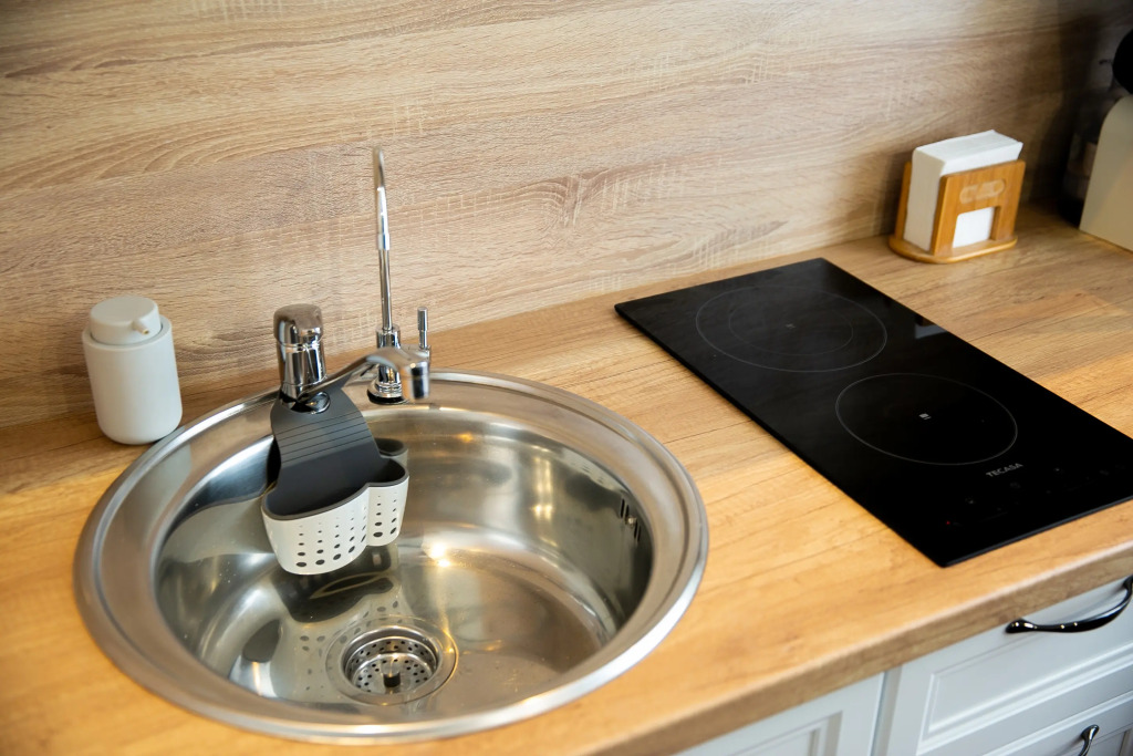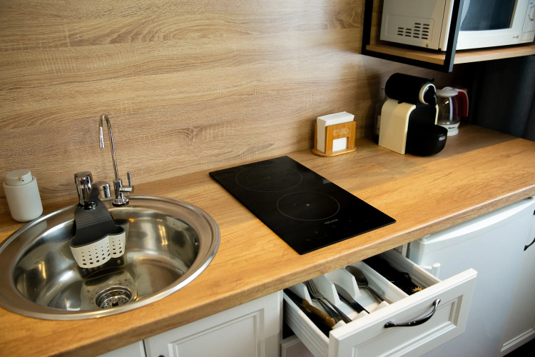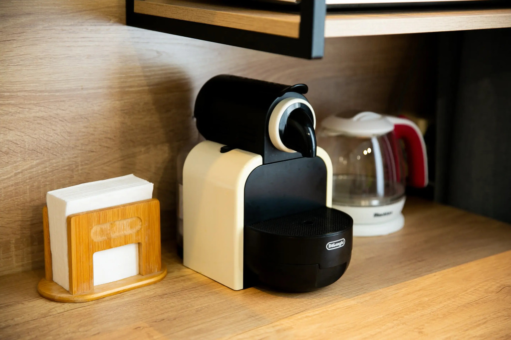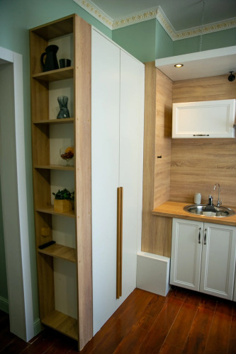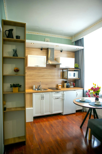 Апартаменты 23 кв. м могут разместить 3-х гостей. Есть необходимое для комфортного проживания: оборудованная кухня со столовыми принадлежностями, варочной поверхностью, микроволновой печью, чайником, капсульной кофемашиной и обеденным столом.