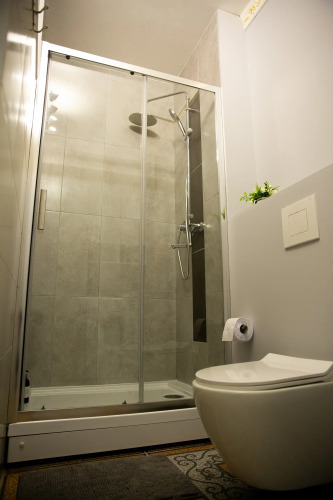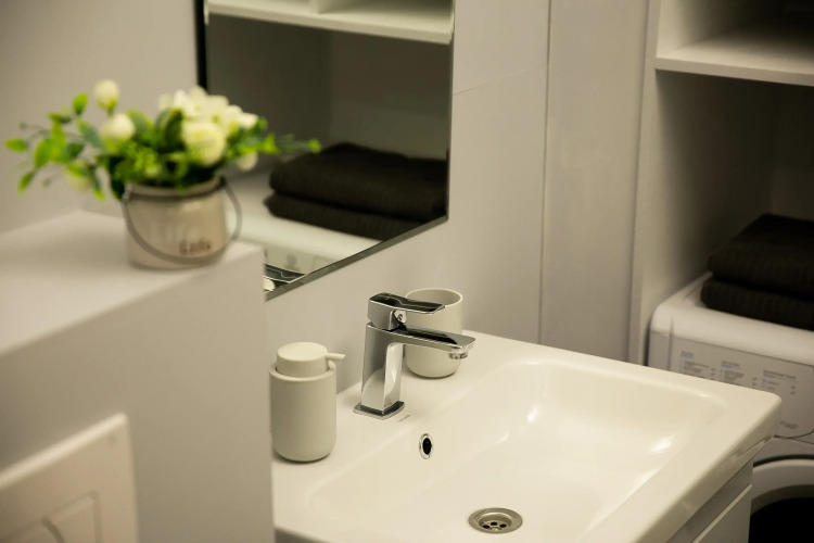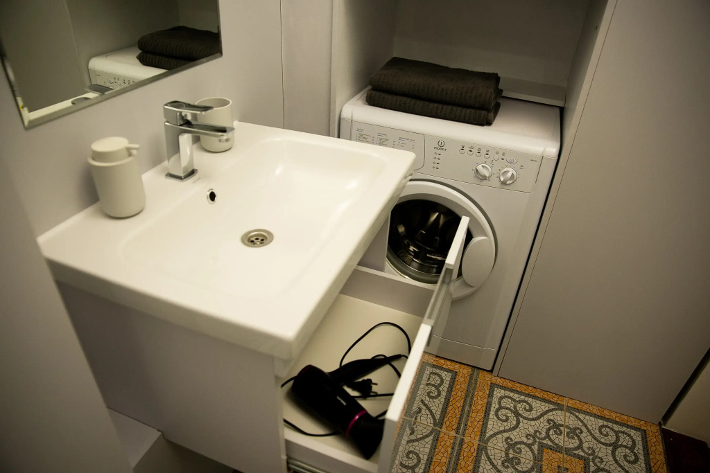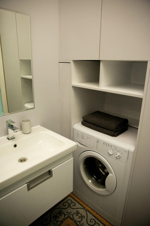 В ванной комнате есть душевая кабина, стиральная машина, сантехника, сушилка для белья, фен.