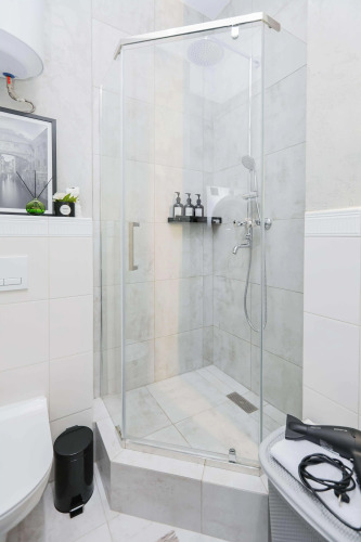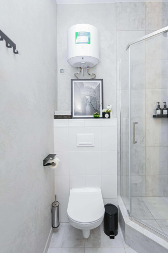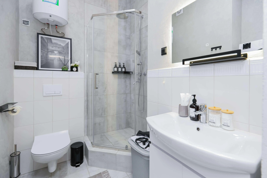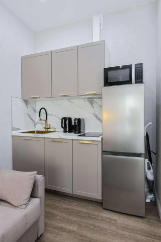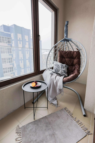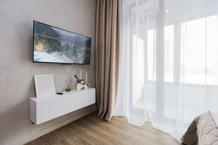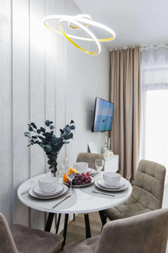 Квартира рассчитана на 4 гостей. Есть двуспальная кровать с ортопедическим матрасом и двуспальный раскладной диван с матрасом. Кухня укомплектована техникой, посудомоечной машиной, кофемашиной, фильтром для воды, необходимой посудой. В обеденной зоне — включает раздвижной стол и стулья. В ванной комнате есть душевая кабина, туалетные и гигиенические принадлежности, стиральная и сушильная машины, фен. В квартире — кондиционер, водонагреватель, утюг, гладильная и сушильная доски, панорамный балкон с креслом-качелей. Доступен Wi‑Fi, установлены умный телевизор с голосовым управлением и Smart TV. Гостям предоставляются комплекты постельного белья из хлопка и махровые полотенца.