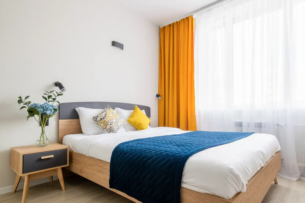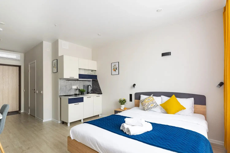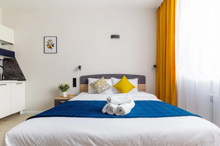 Квартира рассчитана на размещение до 3 гостей, площадь составляет 25 кв. м. В квартире установлены кондиционер, двуспальная кровать и дополнительное спальное место в виде раскладушки. Предоставляются постельное бельё и полотенца, туалетные принадлежности включают шампунь, мыло, гель для душа, а также чай и сахар.