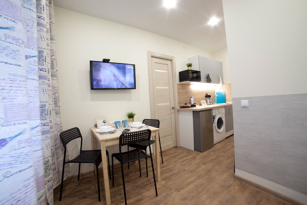 Имеется двуспальная кровать с постельным бельём, телевизор, бесплатный Wi-Fi. Кухонная зона оборудована холодильником, микроволновой печью, электрической плитой, электрочайником, посудой, кухонной утварью. В ванной комнате предоставляются полотенца, фен, средства гигиены: шампунь, гель для душа, жидкое мыло. Имеется стиральная машина, сушилка, утюг, гладильная доска.