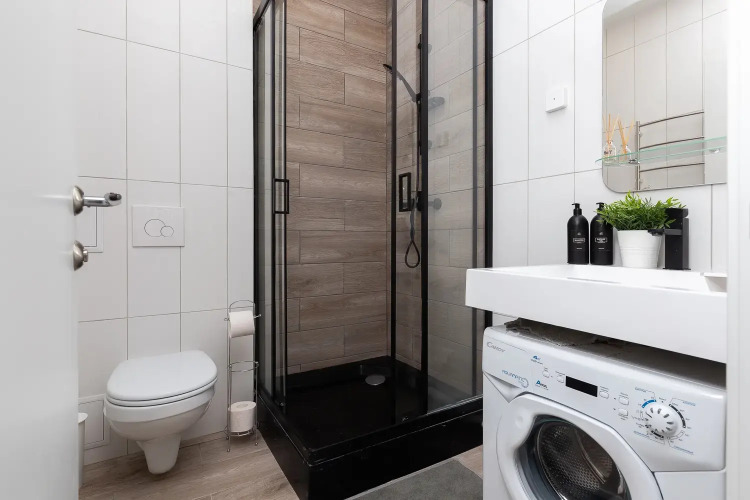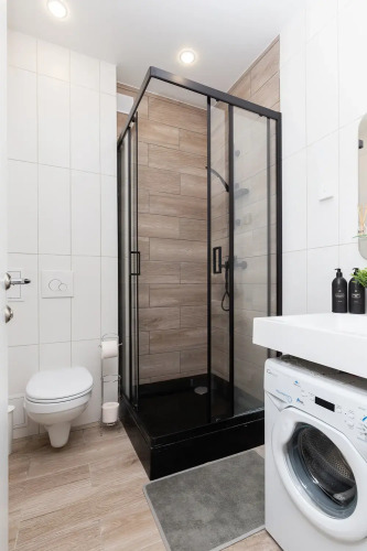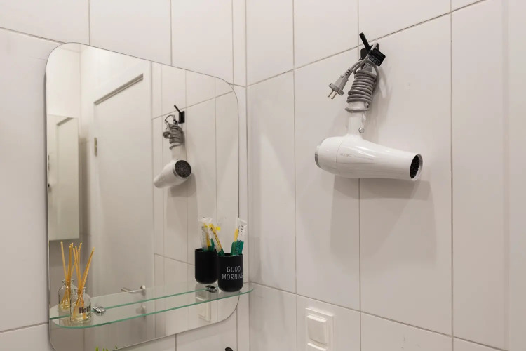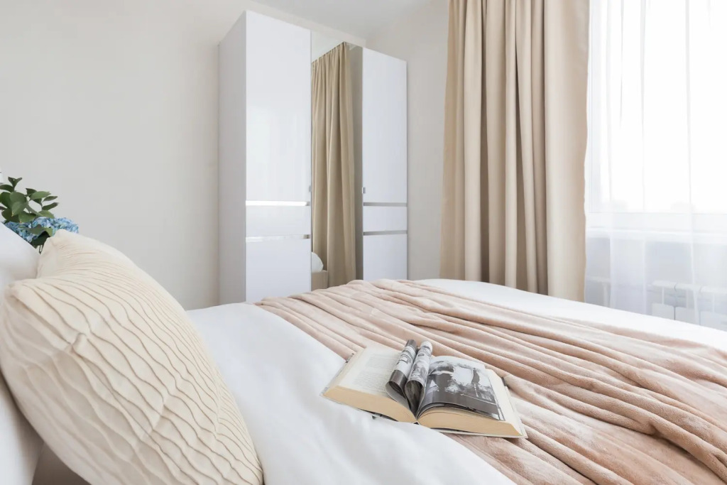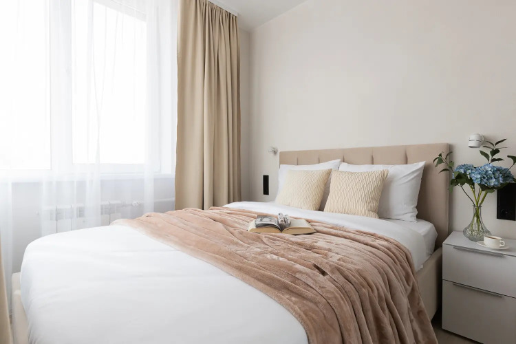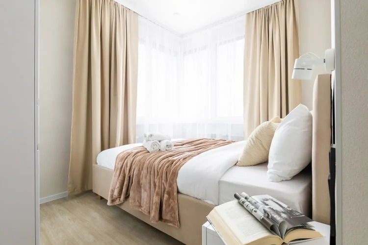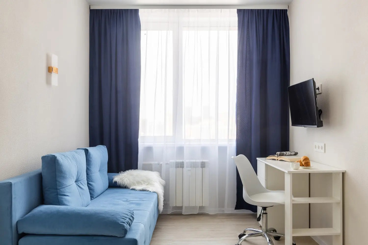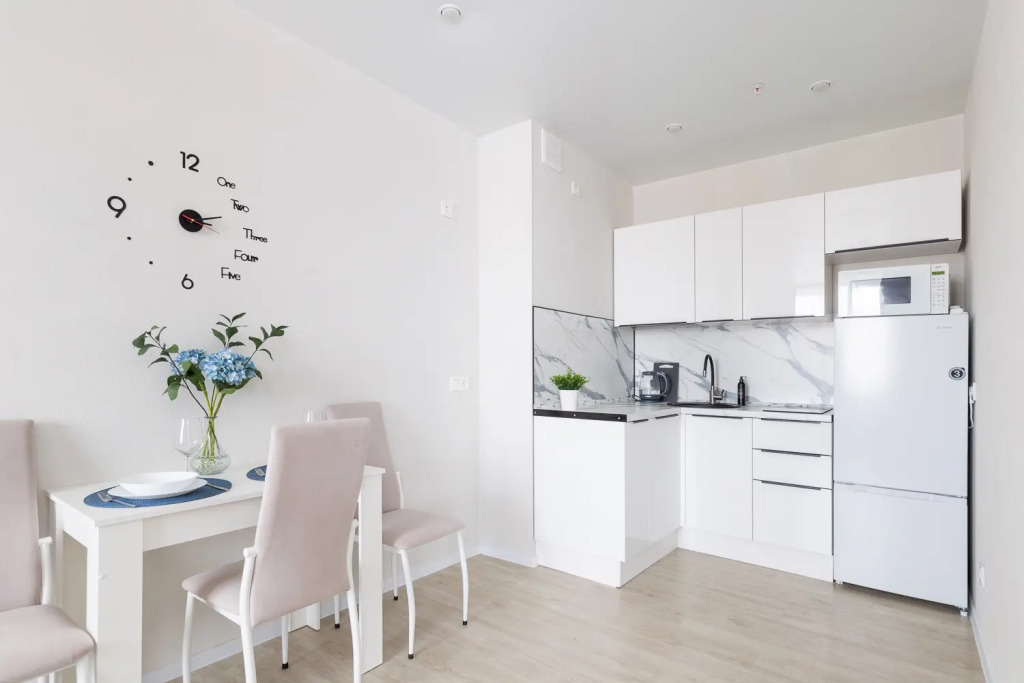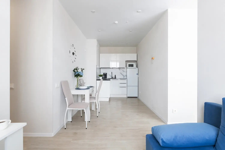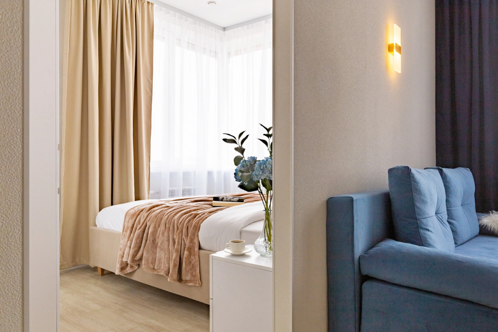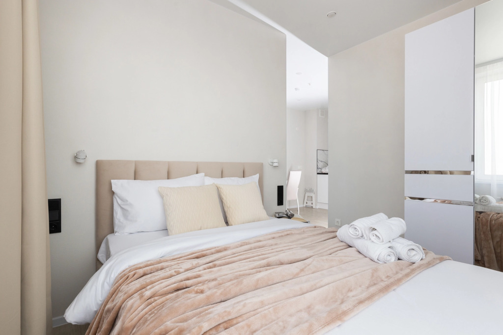 Квартира-студия площадью 30 кв. м рассчитана на размещение до 4 гостей. В распоряжении гостей двуспальная кровать, диван-кровать, постельное бельё и полотенца. Квартира оснащена телевизором с функцией Smart TV, стиральной машиной, плитой, холодильником, микроволновой печью, электрическим чайником, феном, утюгом. Кухонная зона оборудована посудой и кухонными принадлежностями. Гостям предоставляются туалетные принадлежности, чай, сахар и Wi-Fi.