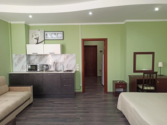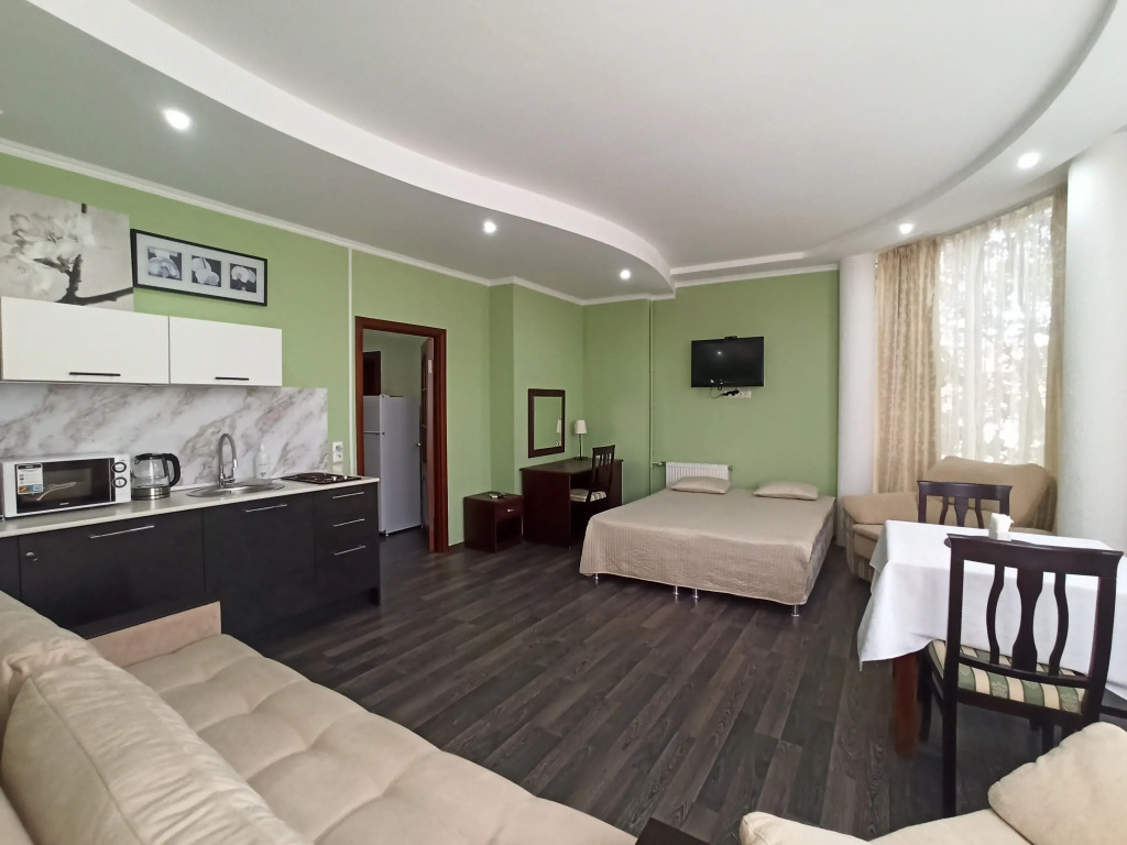 К услугам гостей четырёхместные апартаменты с кухонной зоной и панорамным видом на горы. Апартаменты расположены на третьем этаже отеля и подойдут для семейного отпуска.