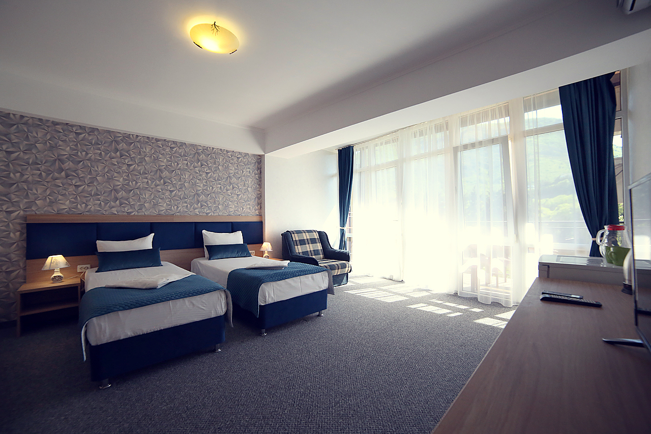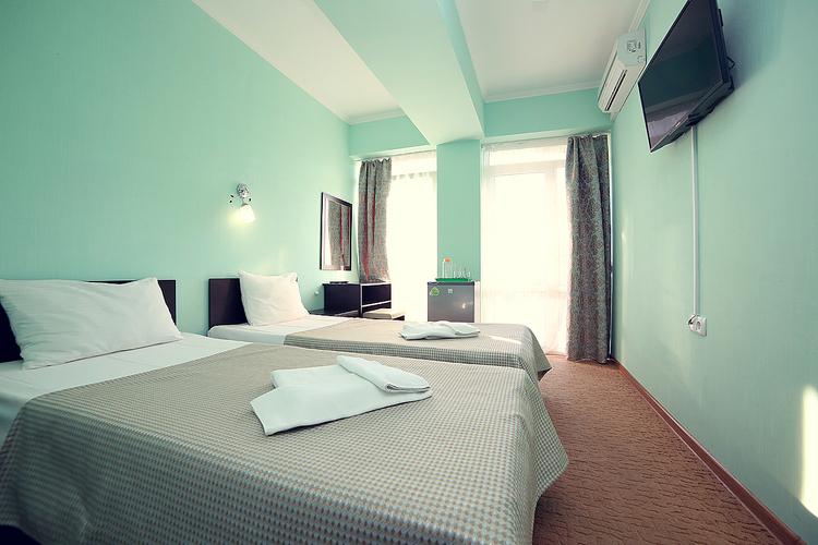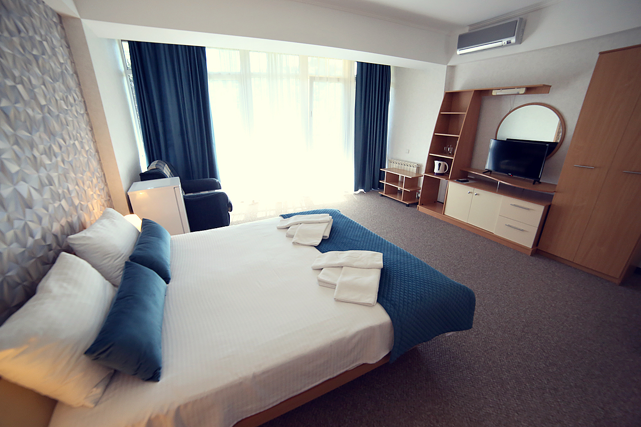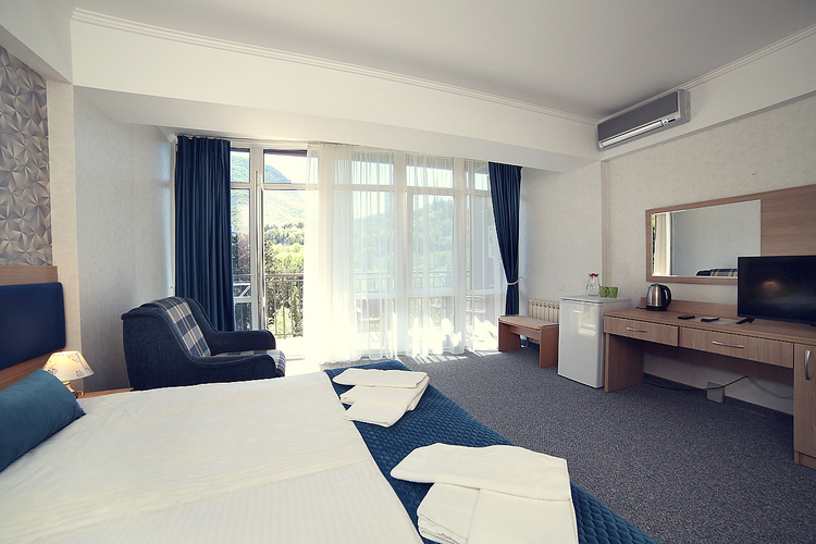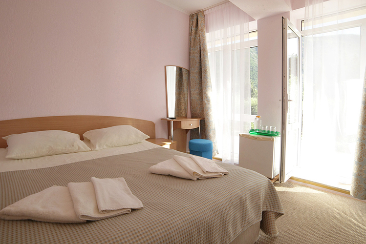 Однокомнатный номер с возможностью размещения трех гостей. Каждый номер этого типа с балконом и видом на легендарную Медведь-гору. В номере кондиционер, телевизор, холодильник, чайник, приборы для чаепития, душ, удобства.