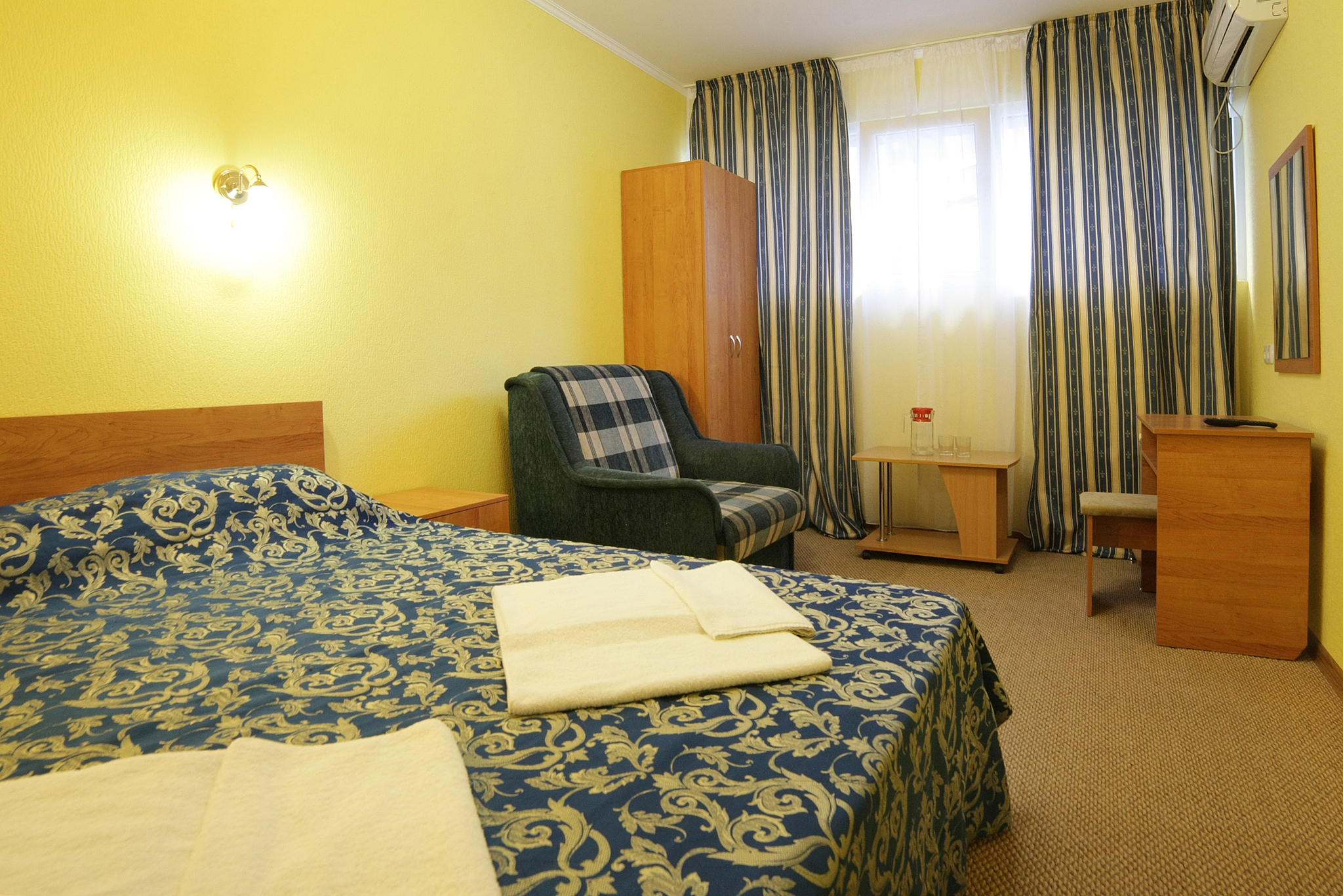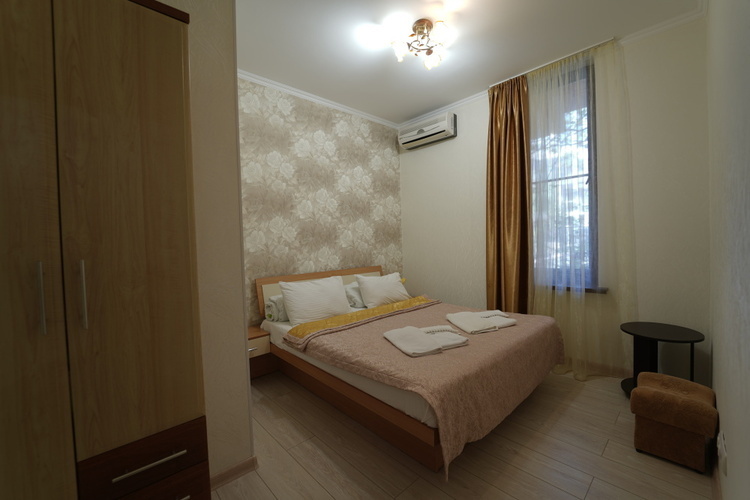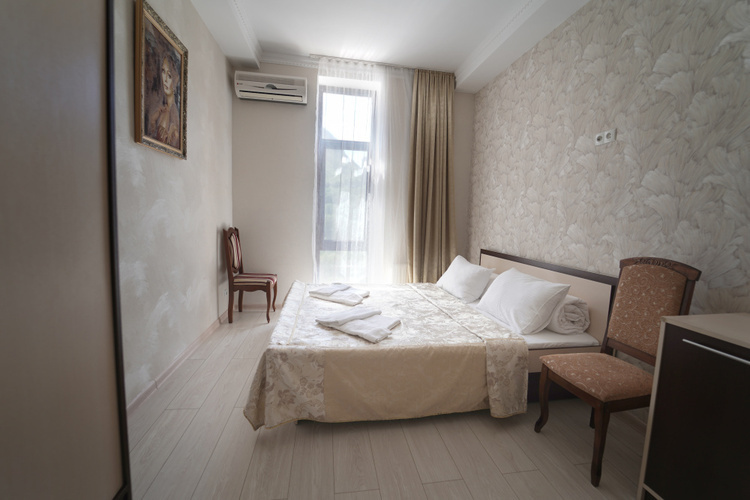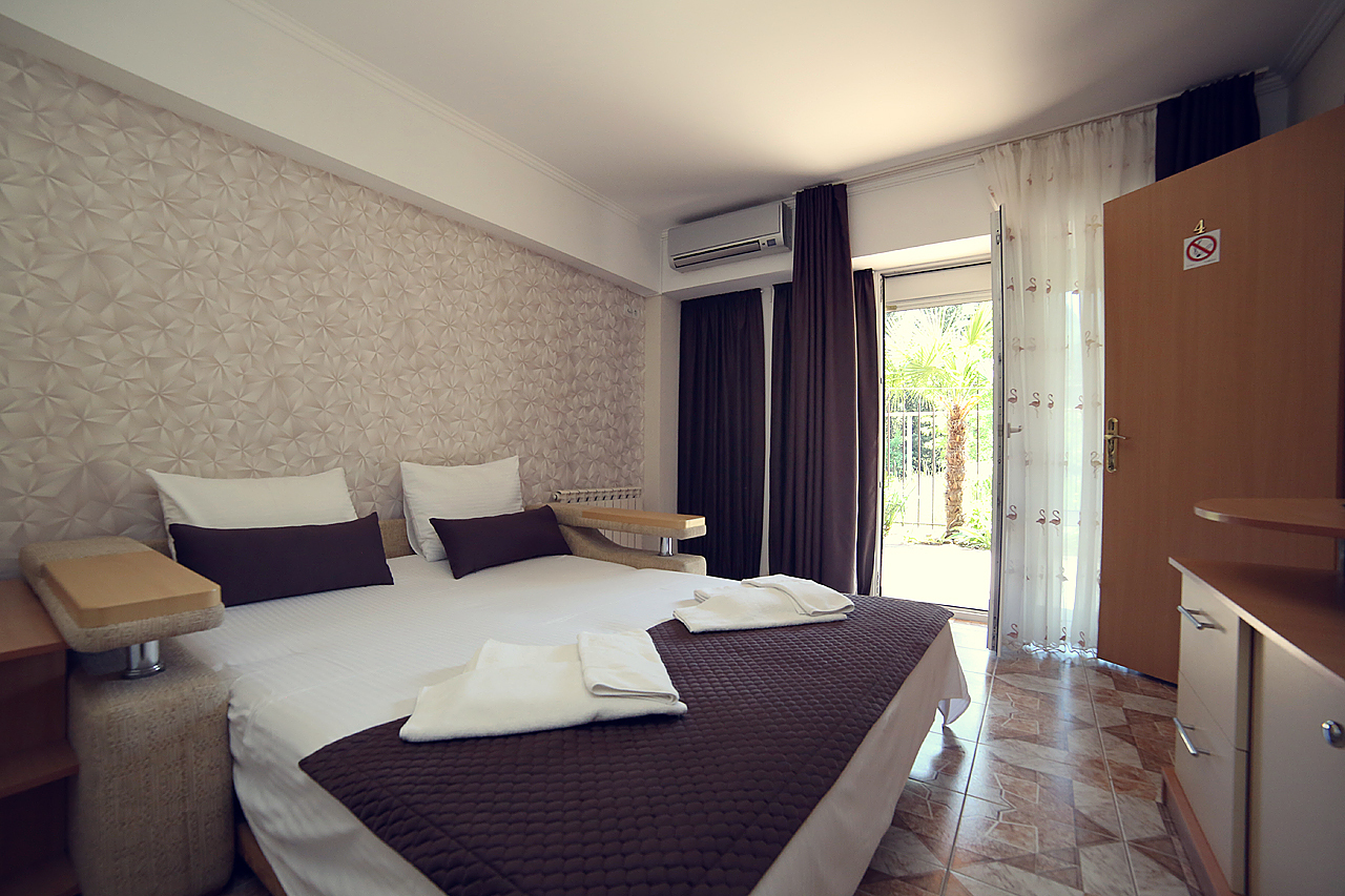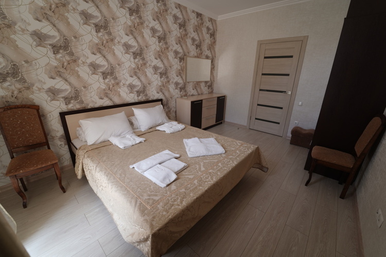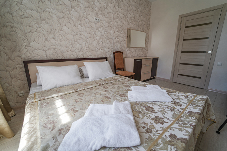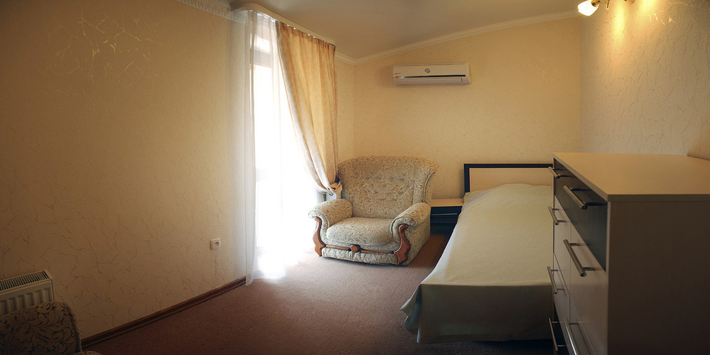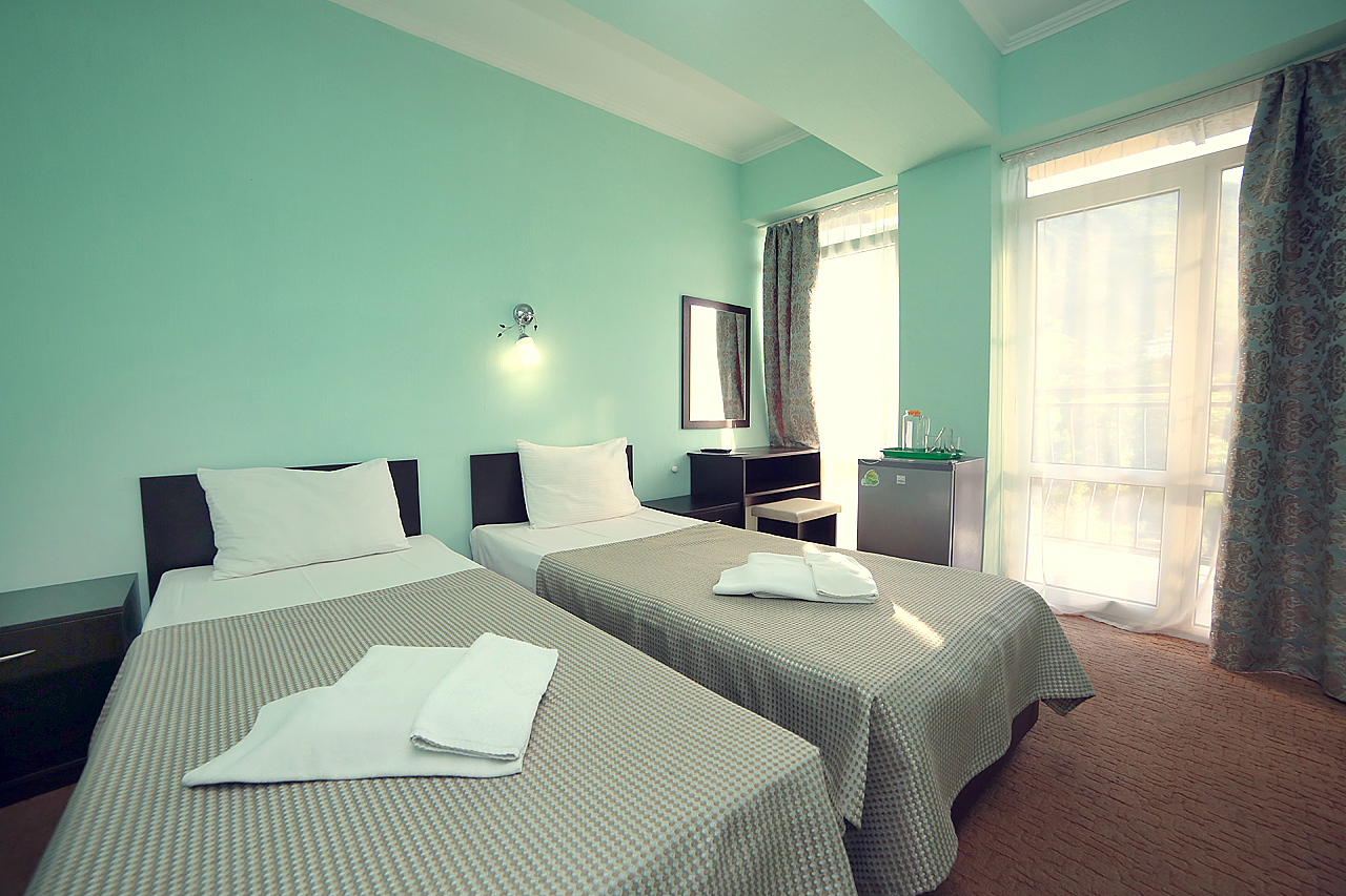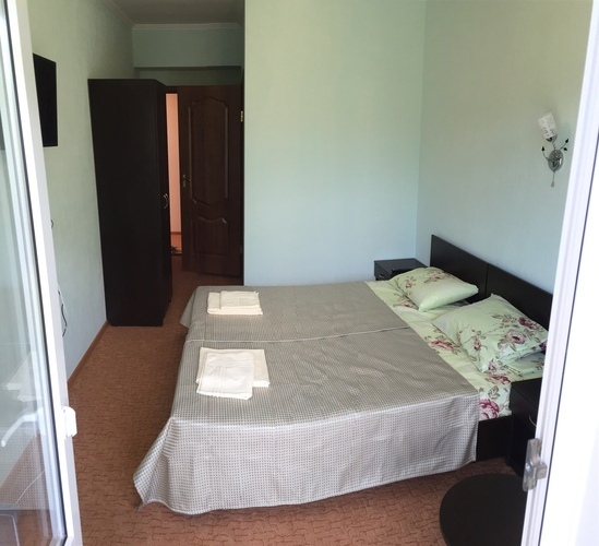 Двухместный номер с двумя односпальными/совмещенными кроватями. Особенность этого номера в наличии балкона. Балконы части номеров выходят на на Медведь-гору, открывая захватывающий вид крымских гор, другие - во двор на теневую сторону, что способствует более прохладному микроклимату в комнате. В номере кондиционер, холодильник, телевизор, душ, удобства.