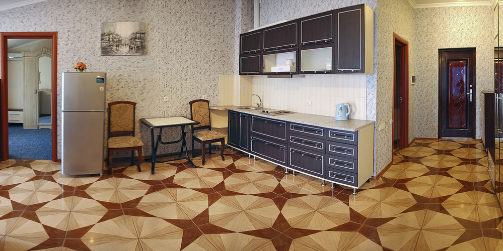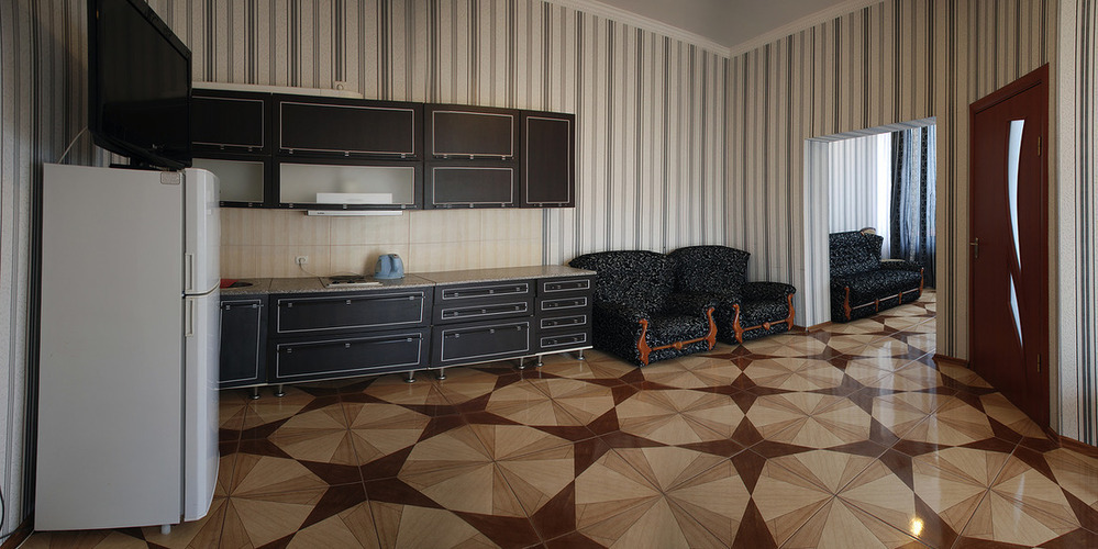 Просторный трехкомнатный номер для семейного отдыха с балконом или панорамным окном с видом на легендарную Медведь-гору. В каждой комнате кондиционер. Номер оборудован мини-кухней с электроплитой, чайником и столовыми принадлежностями. В номере ванна или душевая кабина.