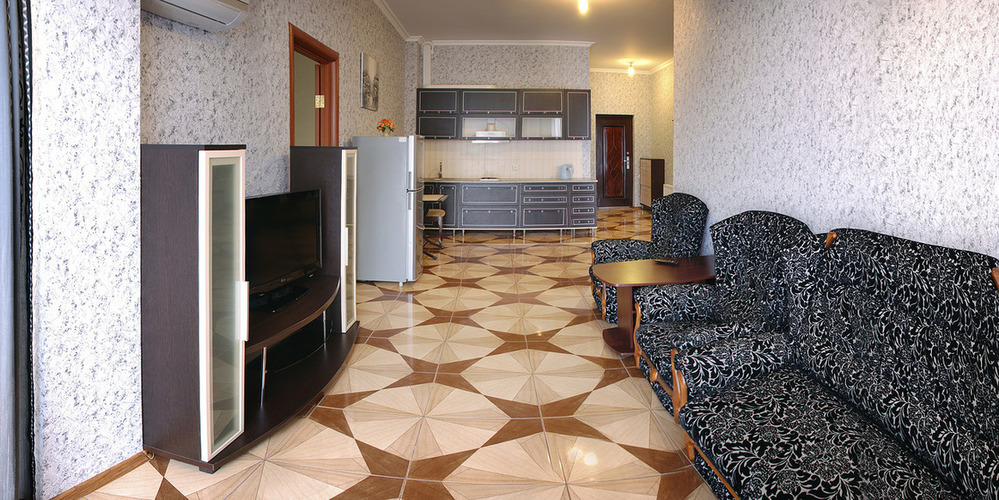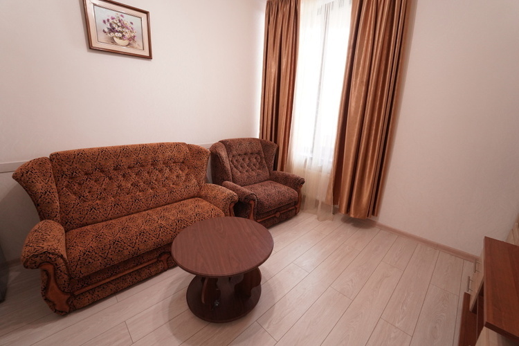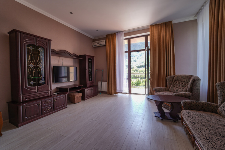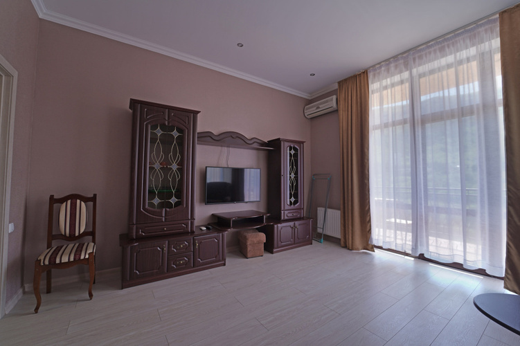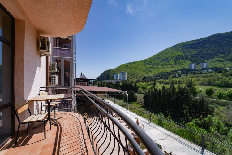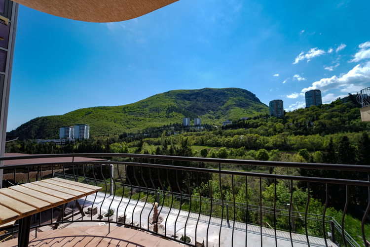 Двухкомнатный номер с меблированным балконом или панорамным окном с видом на Медведь-гору. С собственной ванной комнатой. В номере холодильник, телевизор, чайник, приборы для чаепития. В каждой комнате кондиционер.
