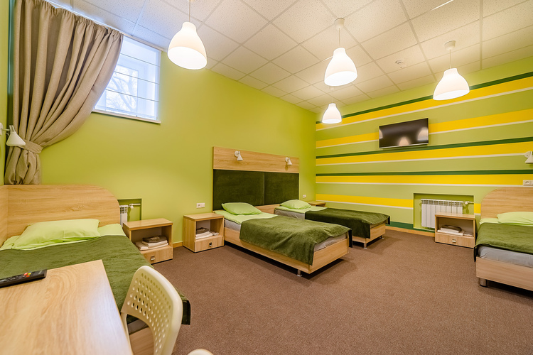 Стандартный четырёхместный номер с собственной ванной комнатой вне номера. Номер расположен на 1 этаже. В распоряжении гостей небольшая обеденная зона: холодильник, СВЧ-печь, электрический чайник, кулер, посуда.
