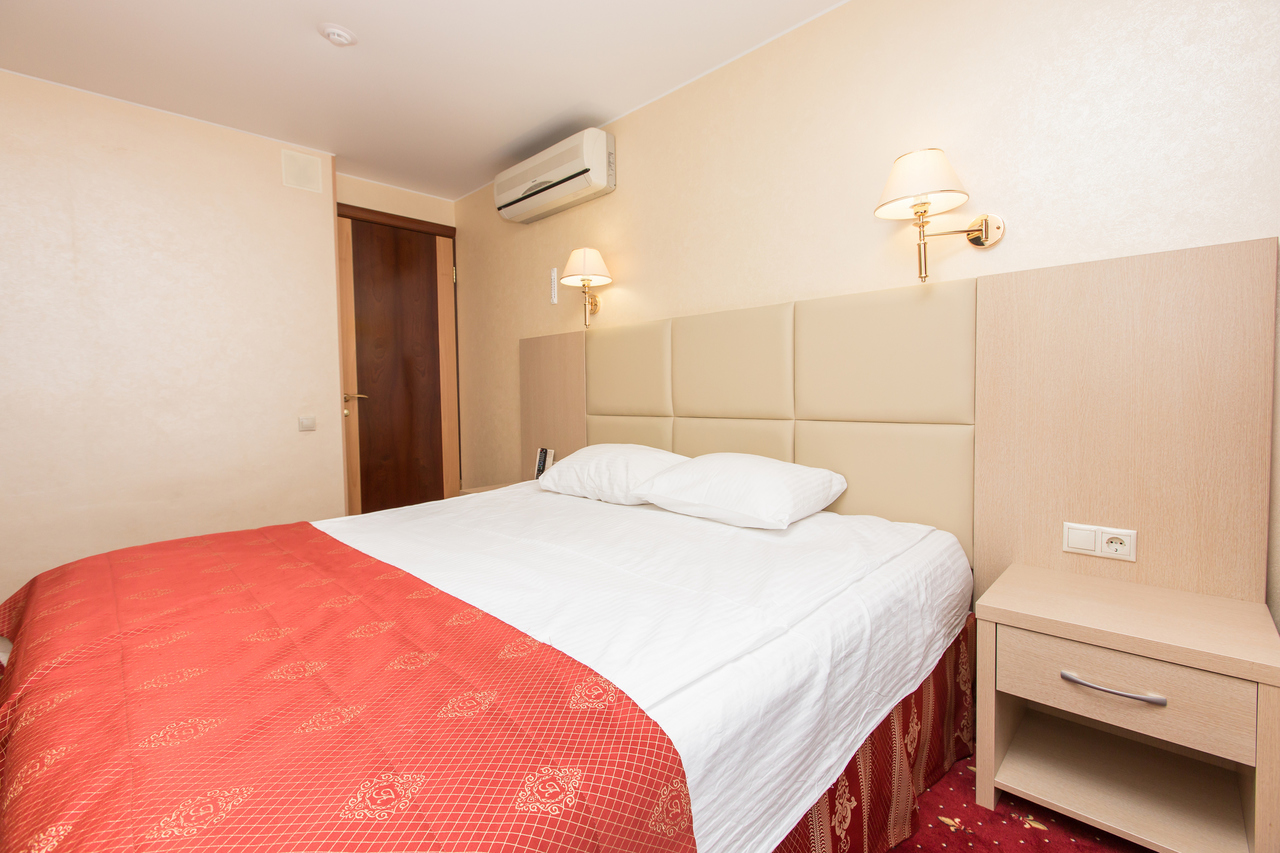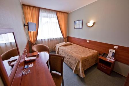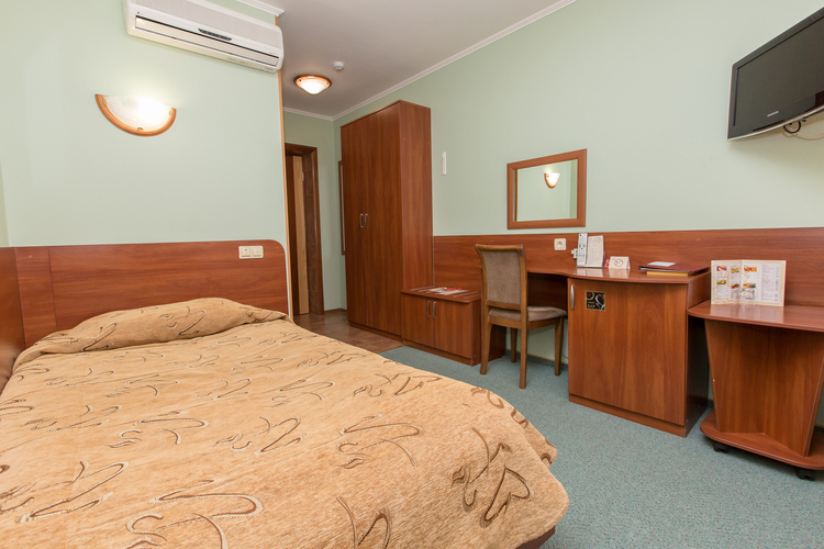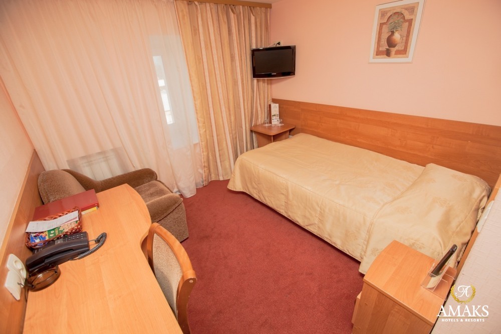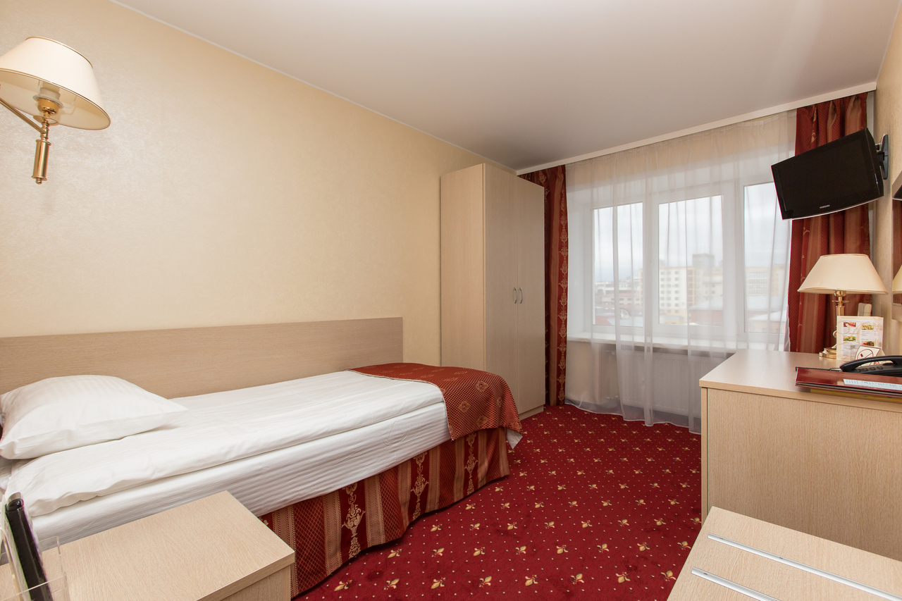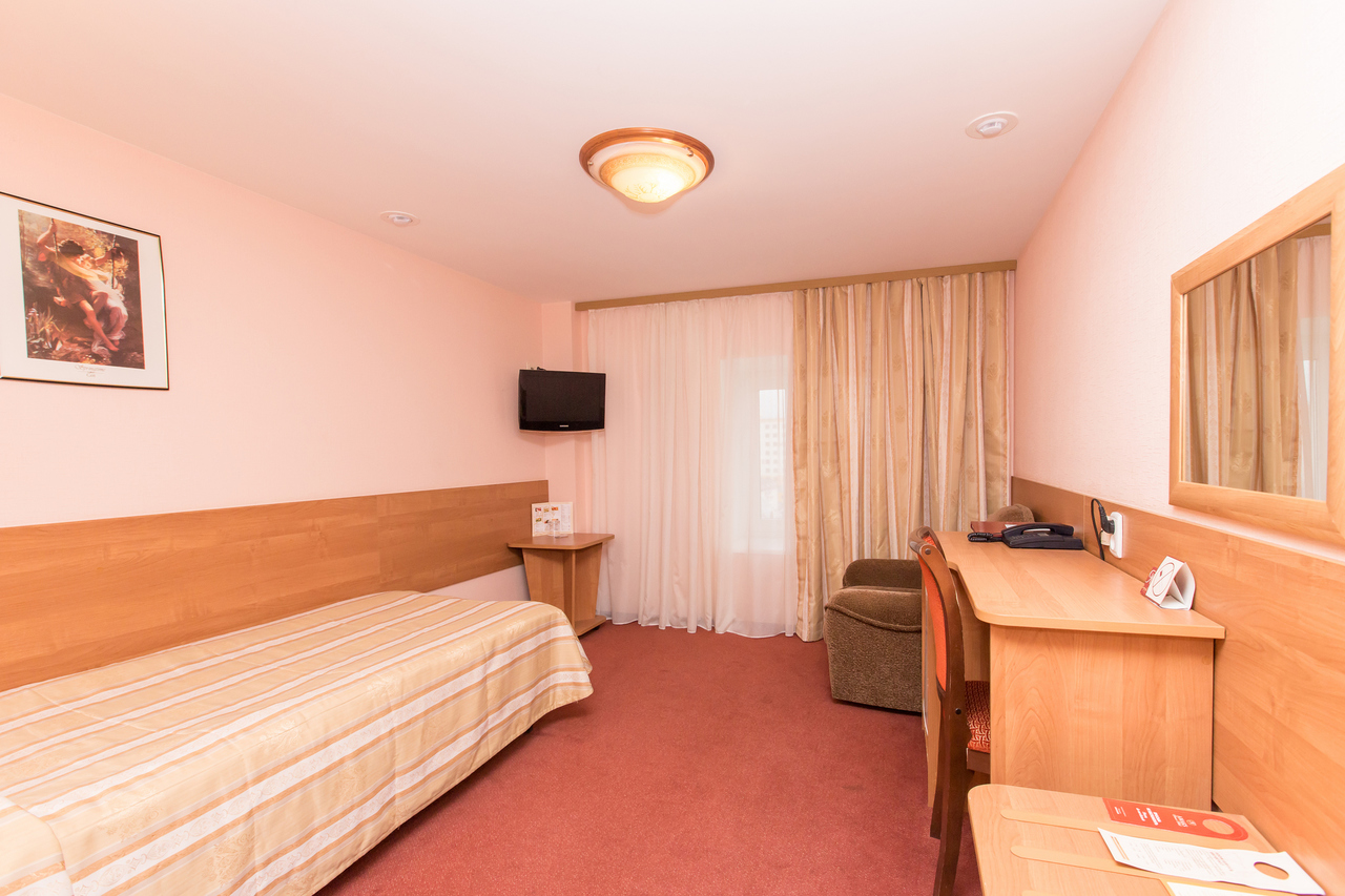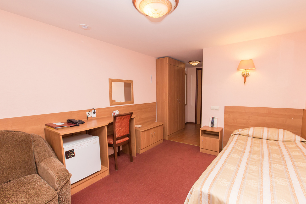 Одноместный номер. Площадь номера 12 кв.м. В номере есть все необходимое - односпальная кровать, рабочий стол, прикроватная тумба, телевизор, мини-бар за дополнительную плату. В номере ванна, туалет.