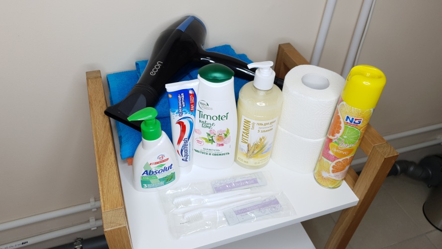 Предоставляется приветственный комплимент в виде чая, кофе, конфет, а также предметов первой необходимости (шампунь, гель для душа, зубная паста, туалетная бумага).