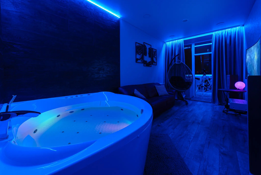 Квартира выполнена по эксклюзивному дизайн-проекту, подходят как для отдыха, так и для проживания на любой срок. Имеется встроенная система вентиляции. Высота потолков — 3 метра, толстые кирпичные стены. Установлена многозонная синхронная RGB-подсветка во всей квартире. Имеются «лунные качели» и ролевые элементы в спальне.