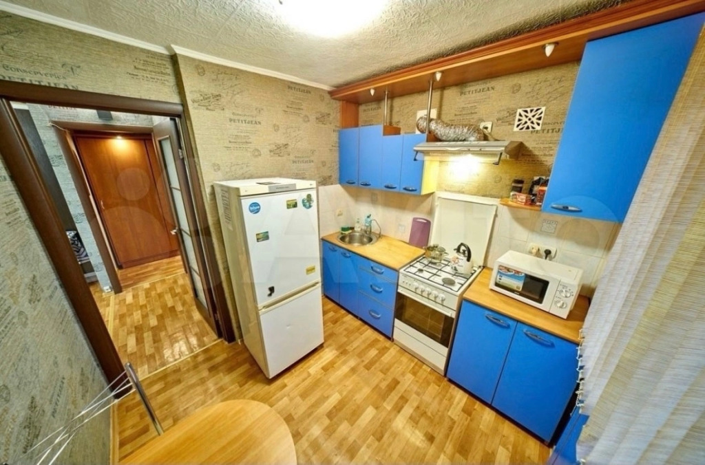 Кухня оснащена холодильником, плитой, вытяжкой, микроволновой печью, чайником, фильтром для воды, посудой и приборами.