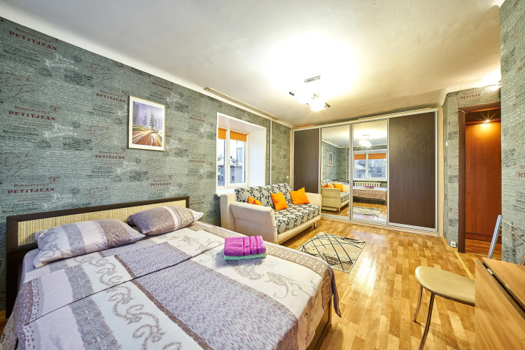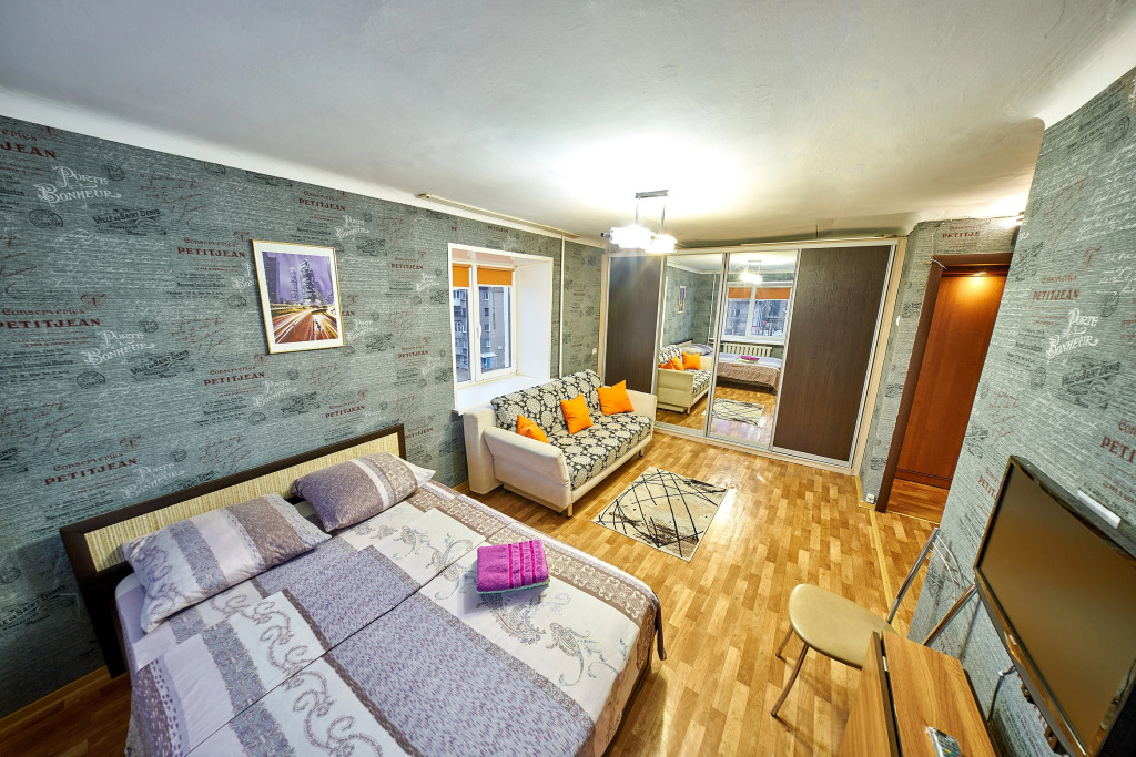 В апартаментах предусмотрено: двуспальная кровать и раскладной диван, телевизор с функцией Smart TV, шкаф-купе, утюг, гладильная доска, пылесос, высокоскоростной Wi-Fi.