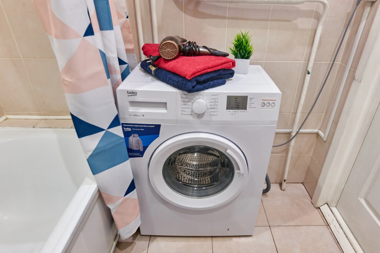 В ванне — совмещённый санузел с ванной, душем, стиральной машиной, феном, средствами гигиены и стиральным порошком.