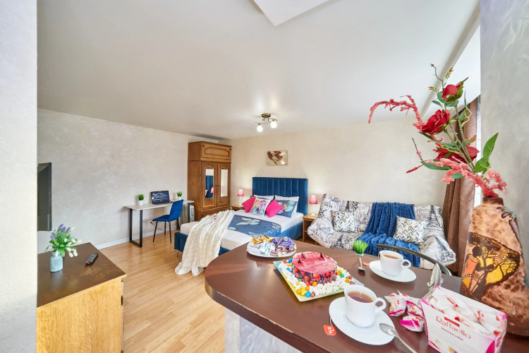 Для владельцев автомобилей есть возможность парковки на придомовой территории. Во дворе есть игровая площадка. В апартаментах: двуспальная кровать, раскладной диван и раскладная кровать со встроенным матрасом для размещения до пяти человек, шкаф для одежды, ЖК-телевизор, кухня с холодильником, плитой и духовкой, вытяжкой, микроволновкой, чайником, фильтром для воды и приборами и посудой, совмещённый санузел с ванной и душем, стиральной машиной, водонагревателем, феном, вентиляцией, гигиеническими принадлежностями, стиральным порошком, гладильная доска, утюг, пылесос, бесплатный высокоскоростной Wi-Fi.
