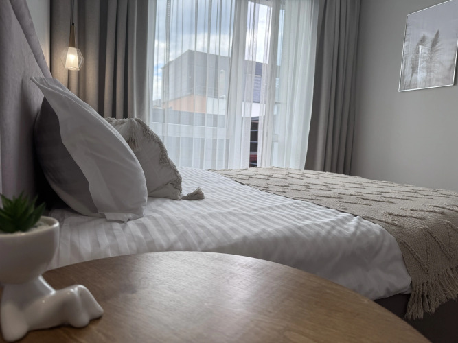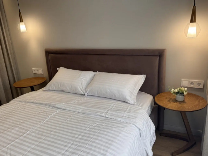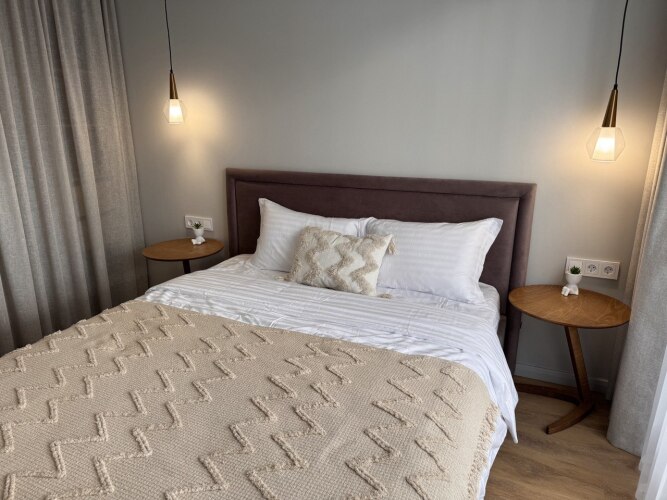 Апартаменты располагаются на 5/5 этаже, есть лифт. Апартаменты имеют вид на реку из панорамного окна. Апартаменты введены в эксплуатацию с мая 2024 г. с новой техникой, мебелью и санузлом. Размещение подходит для бизнес-туристов, семейного отдыха, а также соло-путешественников.