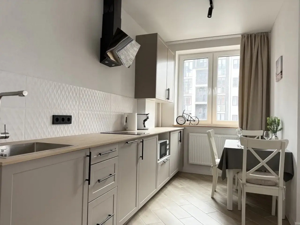 В квартире имеется кровать 180х200 см с ортопедическим матрасом и двумя видами подушек. В распоряжении гостей интернет и телевизор, кухня с необходимыми столовыми принадлежностями, кофемашина, посудомоечная машина, холодильник, микроволновая печь, плита. В ванной комнате есть стиральная машина, фен, гигиенические принадлежности, одноразовые тапочки. Для удобства гостей имеется необходимый гладильный инвентарь. Чай и кофе всегда в доступе.