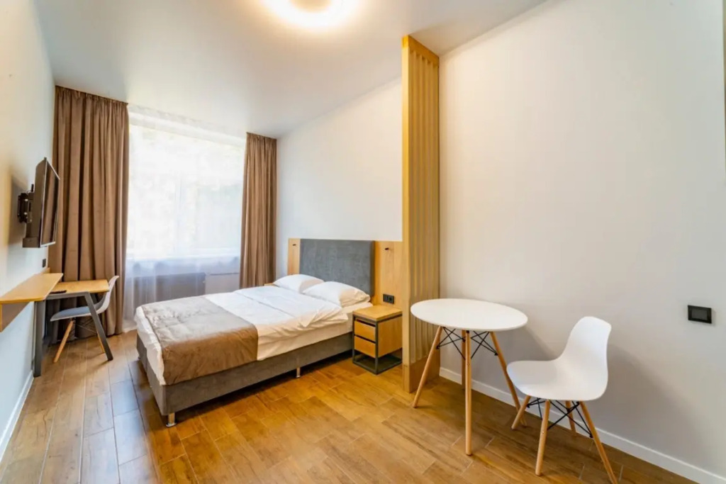 Номер уютно обставлен и оснащён необходимым, чтобы отдохнуть после долгого и насыщенного дня. Имеются телевизор. Оснащение зависит от выбранной категории номера.