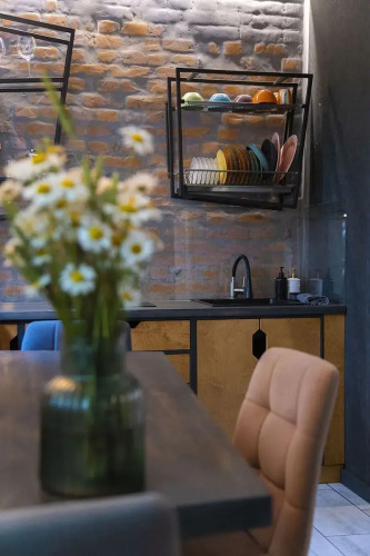 В зоне кухни расположен холодильник, электрическая плита, микроволновая печь и чайник. Также гости могут воспользоваться стиральной машиной, утюгом, гладильной доской, сушилкой для белья и феном. Бонусы для гостей: чай, конфеты, питьевая бутилированная вода, одноразовые тапочки, гель для душа и одноразовые зубная паста и щётка.