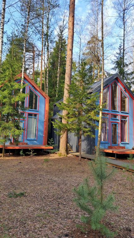 Домики двухэтажные, 55 кв. м, второй этаж — мансардный. Гостям предоставляются постельное бельё и разноцветные полотенца, по запросу детские кроватка и стульчик.